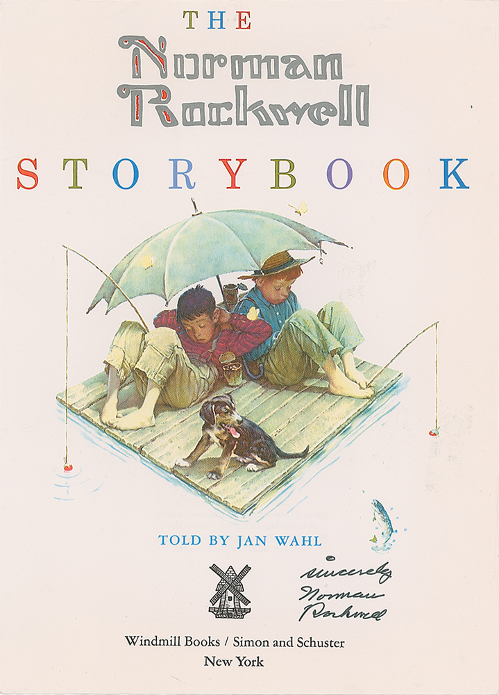 Color 8.5 x 12 title page removed from The Norman Rockwell Storybook, signed below in black felt tip, "Sincerely, Norman Rockwell." In fine condition, with some wear to edges.