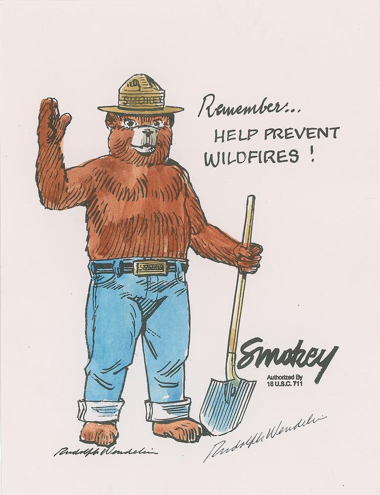 Two printed sketches of Smokey the Bear, 8.5 x 11, embellished with watercolor by Rudolph Wendelin, who signs both in either black ballpoint or red ink, adding the date, “9-15-94,” to the latter. In overall fine condition.