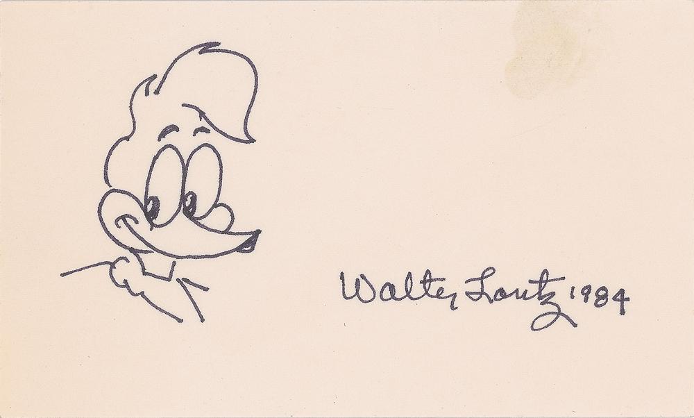 Original sketch of Woody Woodpecker by Walter Lantz, accomplished in black ink on an off-white 5 x 3 card, which is signed, "Walter Lantz, 1984." In fine condition, with a light stain to the upper right blank area.