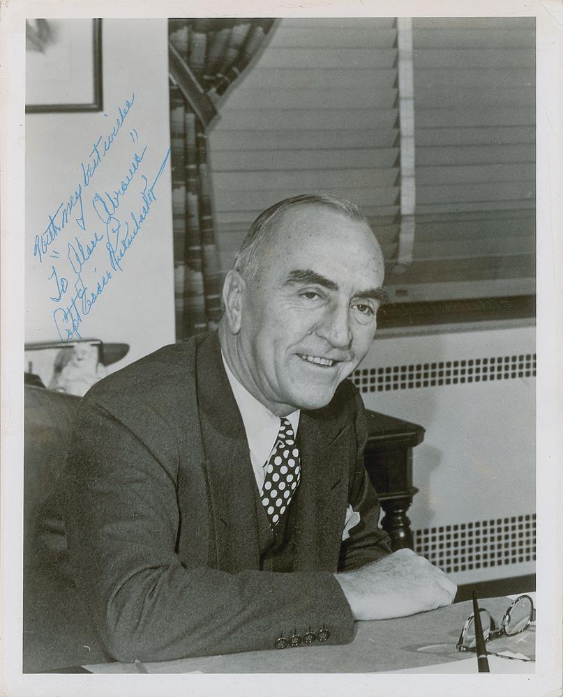 Glossy 8 x 10 photo of Rickenbacker at his desk, signed and inscribed in blue ballpoint, "With my best wishes to 'Alan Abrams,' Capt. Eddie Rickenbacker.” In very good to fine condition, with scattered light creasing, and a light paperclip impression to the top edge.