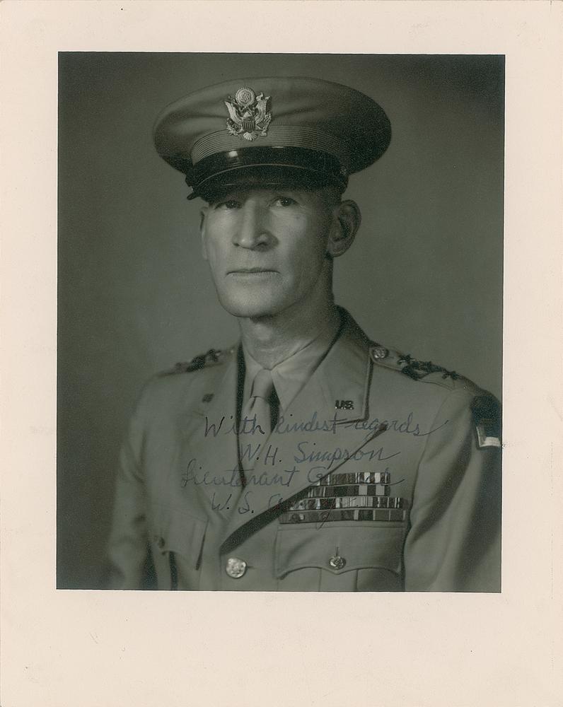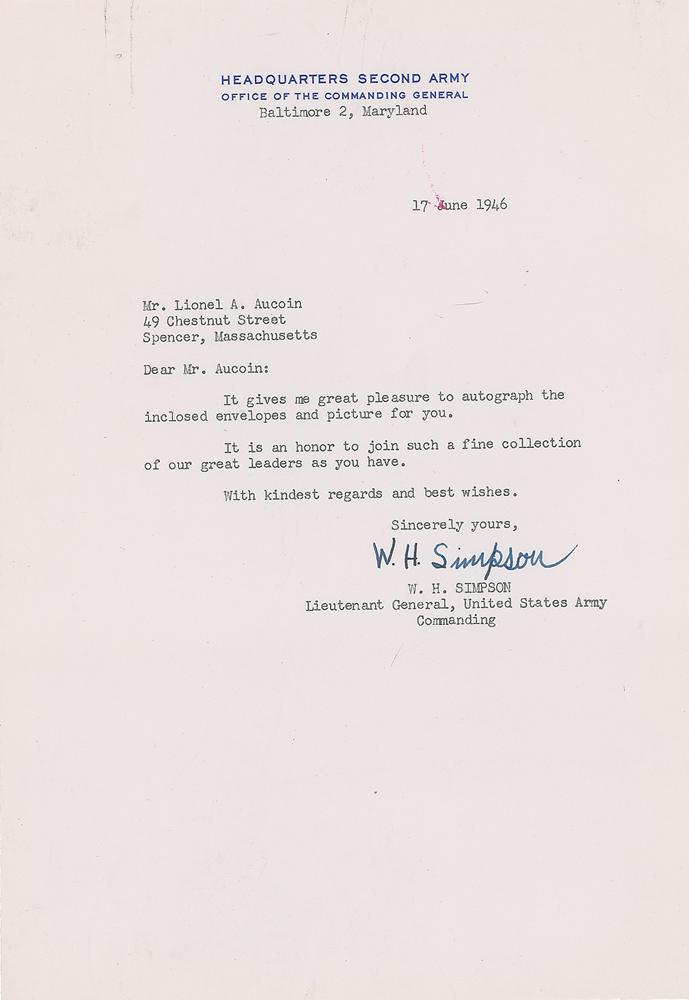 United States Army officer (1888-1980) remembered for commanding the Ninth United States Army in northwest Europe during World War II. Two items: a vintage matte-finish 8 x 10 photo of Simpson in uniform, neatly signed in fountain pen, With kindest regards, W. H. Simpson, Lieutenant General, U.S. Army"; and a TLS, one page, Headquarters Second Army letterhead, June 17, 1946, in part: "It is an honor to join such a fine collection of our great leaders as you have." In very fine condition.