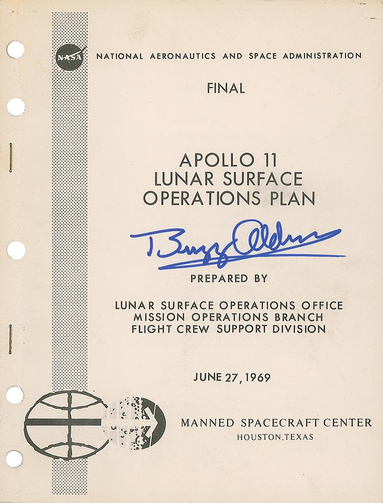 Official staple-bound NASA manual entitled “Final, Apollo 11 Lunar Operations Plan,” dated June 27, 1969, 8 x 10.5, 184 pages, signed on the front cover in blue felt tip by Buzz Aldrin. The manual provides a minute-by-minute plan for the time astronauts Neil Armstrong and Buzz Aldrin were to spend on the lunar surface, with the introduction stating, “This Final Edition?defines equipment requirements, crew/equipment interfaces, and final flight planning and crew activities for lunar surface EVA operations during the first manned lunar mission.” One page inside provides the simple—yet extremely profound—instructions for Armstrong to step foot on the moon, “Descend to footpad?Step to Surface.” In fine condition. Given the typical wear of NASA-printed manuals, this is an exceptionally clean and desirable example, elevated all the more by the presence of history’s second moonwalker. Accompanied by a certificate of authenticity from Novaspace.