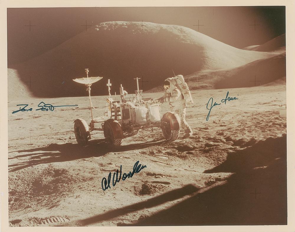 Official color glossy 10 x 8 NASA photo of LMP Irwin standing next to the lunar rover during an Apollo 15 EVA, with the massive Mount Hadley pictured in the background, signed in black felt tip by Dave Scott, Jim Irwin, and Al Worden. Reverse bears purple NASA caption text and "A Kodak Paper" watermarks. In fine condition. An exceptional uninscribed example.
