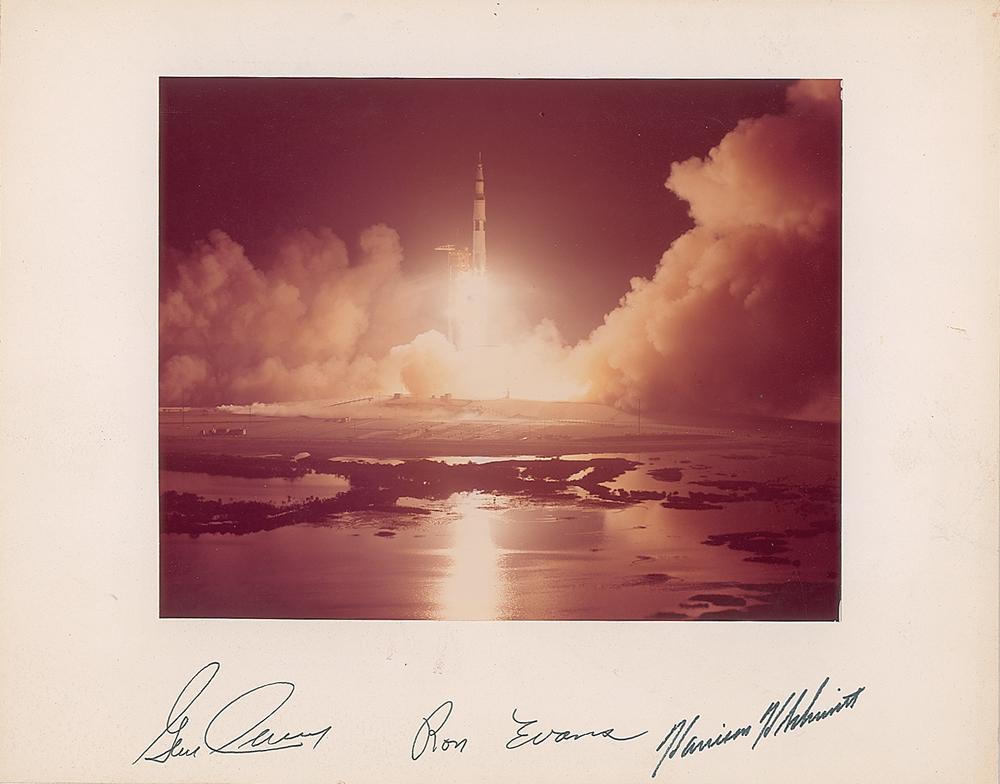 Official color glossy 9.5 x 7.5 NASA photo of the dramatic nighttime launch of the Apollo 17 mission, affixed to the original 14 x 11 mount, which is signed in black ink and felt tip, “Gene Cernan,” “Ron Evans,” and “Harrison H. Schmitt.” In fine condition.