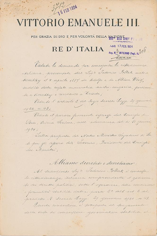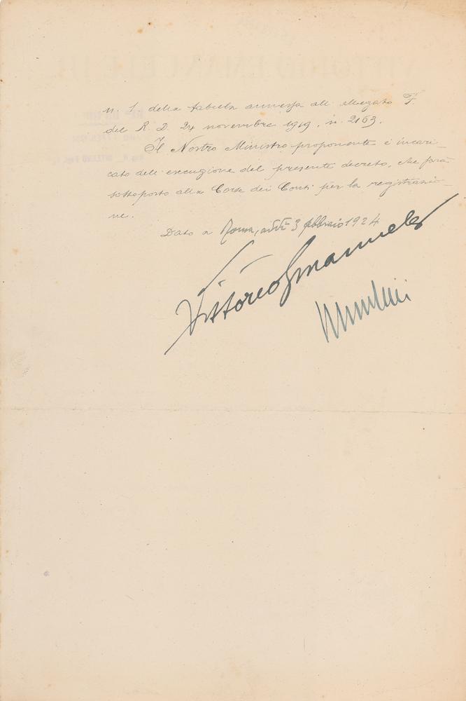 Partly-printed DS in Italian, one page both sides, 9.75 x 14.75, February 3, 1924. Untranslated official document, boldly signed at the conclusion in ink, "Mussolini" and "Vittorio Emanuele." In fine condition, with some foxing to the first page.