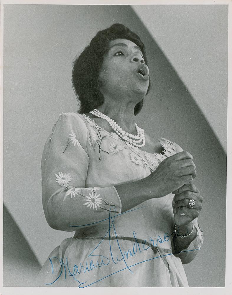 Pioneering African-American contralto (1897-1993) best remembered for her memorable 1939 performance on the steps of the Lincoln Memorial after the Daughters of the American Revolution refused to let her perform for a racially mixed audience at Constitution Hall. Glossy 8 x 10 half-length photo of Anderson during a performance, signed in blue ballpoint. Reverse bears a trio of Federal News Photos copyright stamps. In fine condition.
