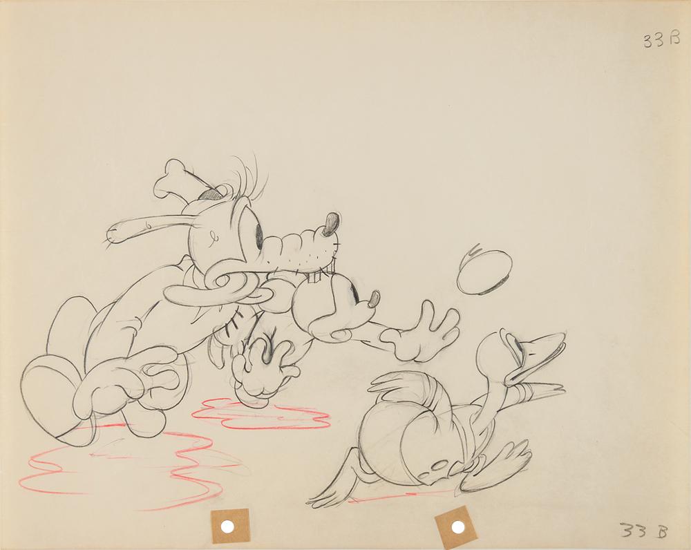 (Walt Disney Studios, circa 1930s) Fantastic original production drawing of Mickey Mouse, Donald Duck, and Goofy from an early Disney short, showing the three iconic characters looking surprised. Accomplished in graphite and colored pencil on untrimmed 12 x 9.5 animation paper. Total image measures 9.5 x 6. In fine condition.