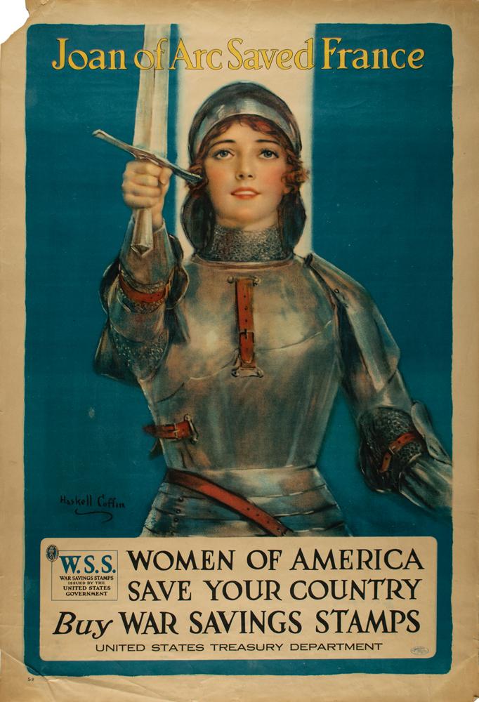 Attractive original color 20.25 x 30.25 poster dating to World War I and published by the United States Printing & Lithograph, Co. of New York [1918], which depicts a Haskell Coffin painting of an armored Joan of Arc raising a sword under yellow text: “Joan of Arc Saved France.” The lower border features bold black text: “Women of America, Save Your Country, Buy War Savings Stamps, United States Treasury Department.” In very good to fine condition, with creasing to the bottom corners, small edge tears, and loss to the upper left corner. Commissioned by the United States Department of the Treasury, Haskell Coffin created this poster in 1918. Feeding off the popularization of Joan of Arc in American culture, Haskell used the image of Joan of Arc to encourage women to buy War Savings Stamps in order to save their country, much as Joan of Arc saved France.