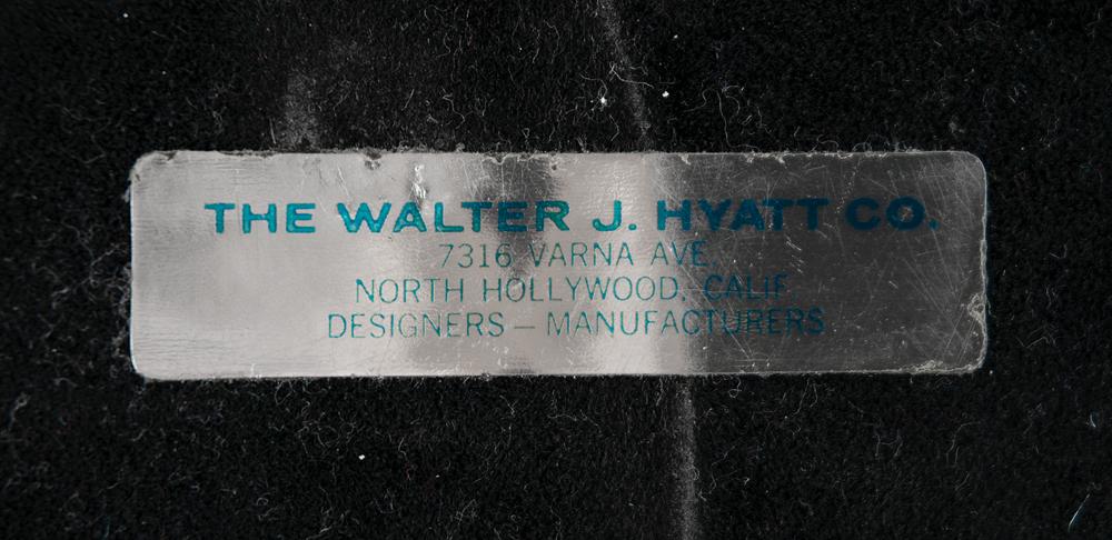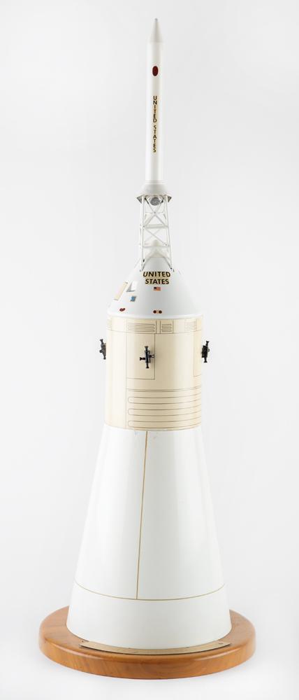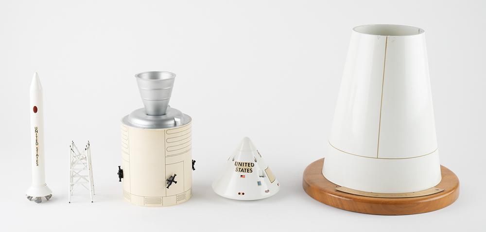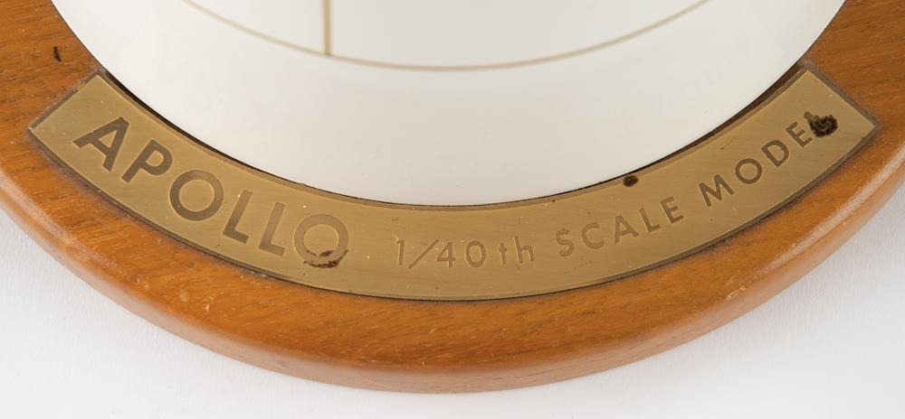 Vintage 1:40 scale model of an Apollo spacecraft by Walter J. Hyatt, Inc., used by NASA as part of an outreach program during the late 1960s and early 1970s. The model, measuring approximately 26.5″ tall, features the payload section of the craft: the command module, the service module, and the lunar module; the escape rocket and tower are included. The capsule is set upon a 9″ diameter wooden base with golden Apollo plate, and the Hyatt label is affixed to the bottom. In very good to fine condition, with expected wear from use and storage, including scattered light scuffing, and some chipping to paint. A wonderful early vintage model of an Apollo spacecraft, the uppermost section of the Saturn V.