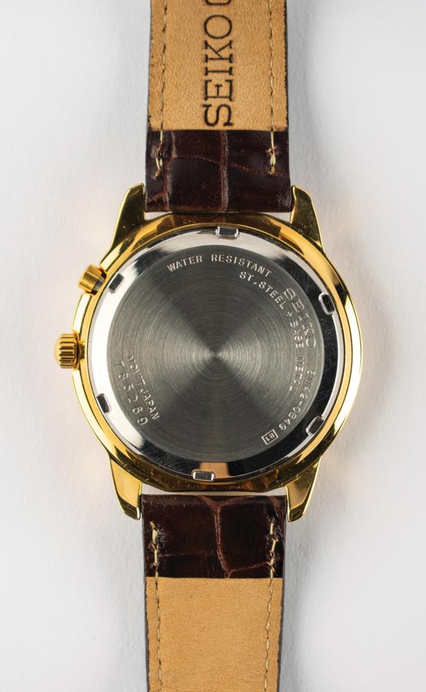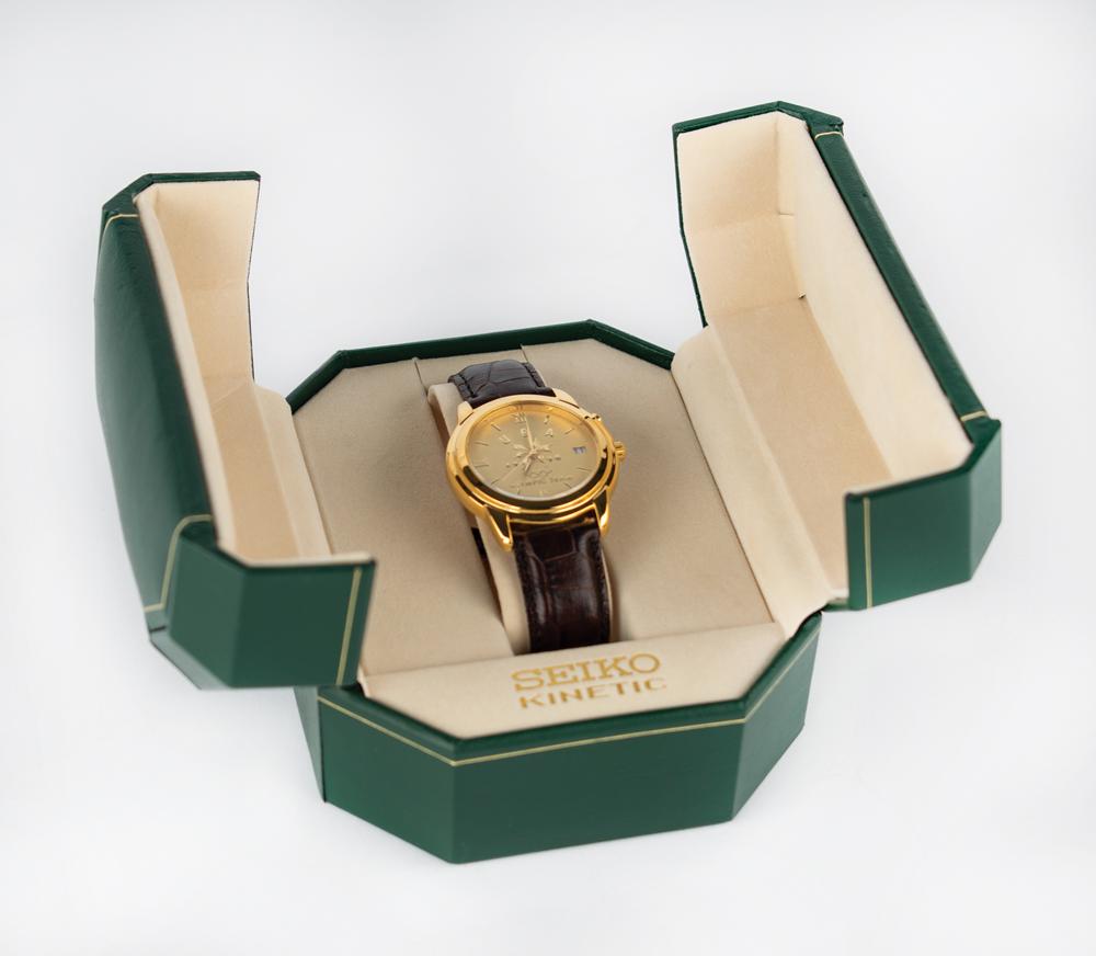 Seiko watch presented to members of Team USA for the Nagano 1998 Winter Olympics, featuring gold-tone face with raised golden text reading: "USA, 1998 Olympic Team," and a depiction of the Olympic rings. The watch features a kinetic movement, gold-tone bezel, Roman numeral hour markers, date at the 3 o'clock position, and a brown leather band. Includes its original box and warranty card.