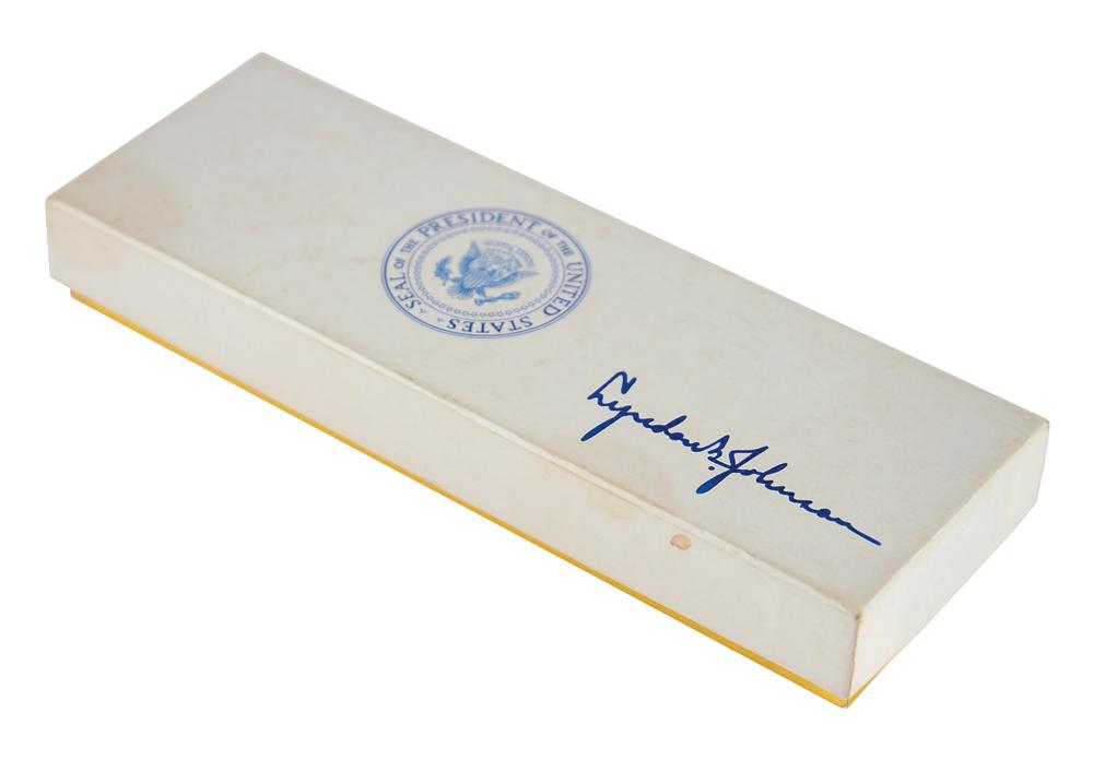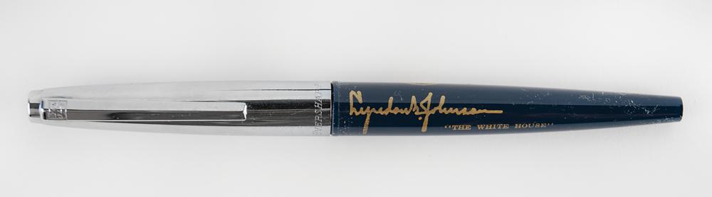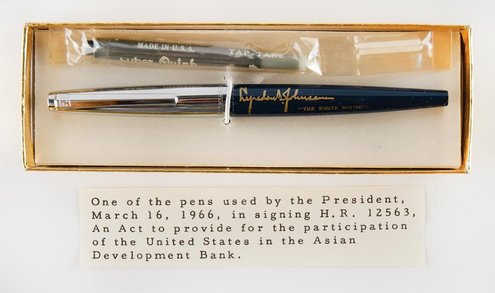 Felt tip pen used by President Lyndon B. Johnson to sign ‘An Act to provide for the participation of the United States in the Asian Development Bank' (H.R. 12563). The official 'bill signer' Eversharp pen measures 5.25″ long and features a navy-blue plastic barrel bearing a gold facsimile signature with presidential seal and a silver-tone cap section. Accompanied by the original presentation box with presidential seal and facsimile signature of President Johnson, as well as a typed caption affirming that the pen was “used by the President on March 16, 1966, in signing H.R. 12563." Also includes a spare ink cartridge. In fine condition.