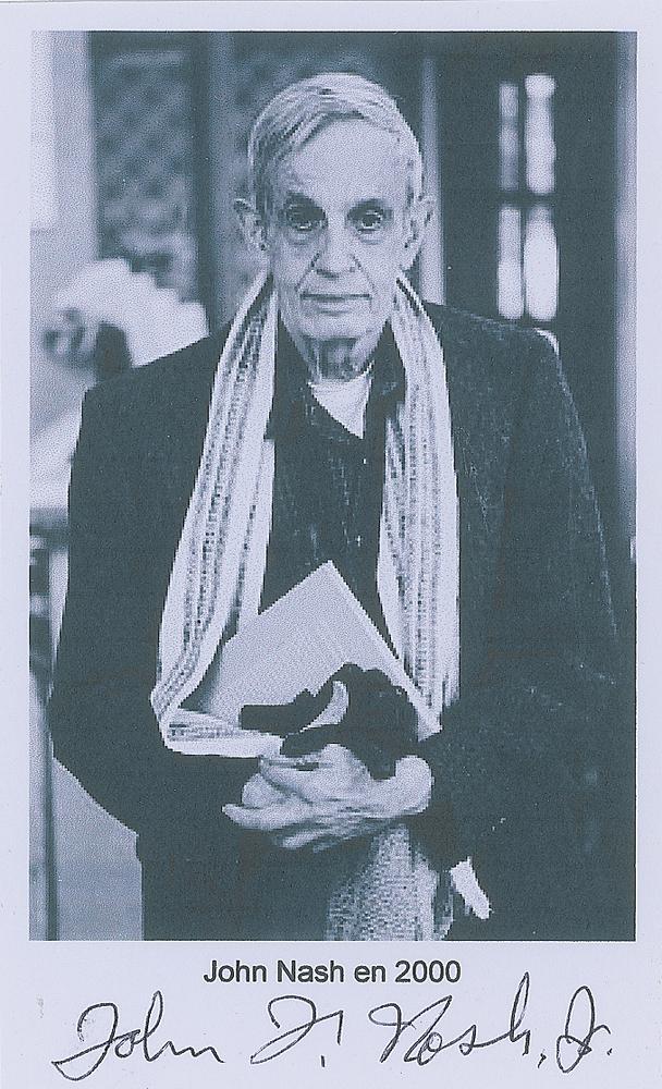 American mathematician (1928-2015) who made fundamental contributions to game theory, differential geometry, and the study of partial differential equations; he is the only person to be awarded both the Nobel Memorial Prize in Economic Sciences and the Abel Prize. Nash's struggles with paranoid schizophrenia became the basis for Sylvia Nasar's biography, A Beautiful Mind, which was later adapted into an Oscar-winning movie. Desirable 3.25 x 5.25 paperstock image of Nash, signed in the lower border in black ballpoint, "John F. Nash, Jr." In fine condition, with a slightly grainy quality to the image.