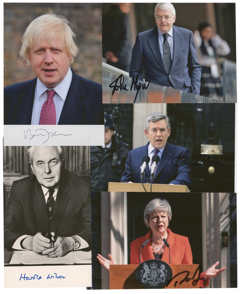Five small photos of British prime ministers, ranging in size from 3.5 x 5.5 to 6 x 4, each signed in ink by the subject. Signers are: Boris Johnson, Theresa May, Gordon Brown, John Major, and Harold Wilson. In fine condition, with a crease to the Wilson photo.