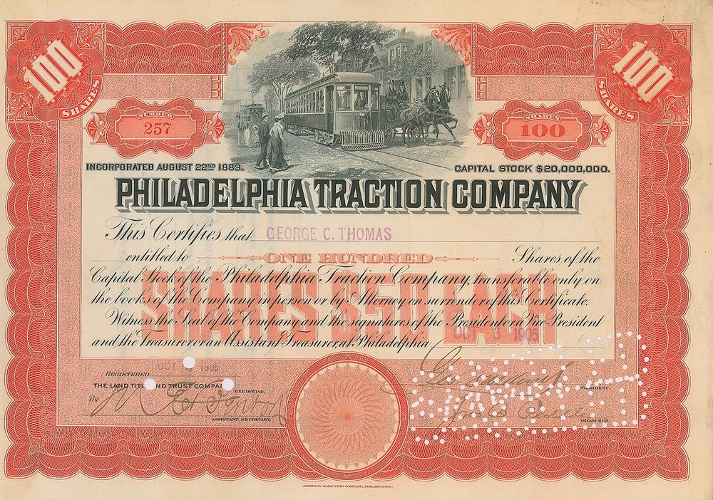 American businessman (1861-1912) who died in the sinking of the RMS Titanic. After the ship struck an iceberg, Widener placed his wife and her maid in a lifeboat. The women were rescued by the steamship RMS Carpathia, but Widener and his son Harry perished on the Titanic. Scarce DS, signed “Geo. D. Widener,” one page, 11.5 x 8.25, October 3, 1905. Stock certificate issued to George C. Thomas for one hundred shares of capital stock in the Philadelphia Traction Company. Signed at the conclusion by George Widener as the company's president, and countersigned by a secretary and the treasurer. In fine condition, with cancellation holes over the signature.