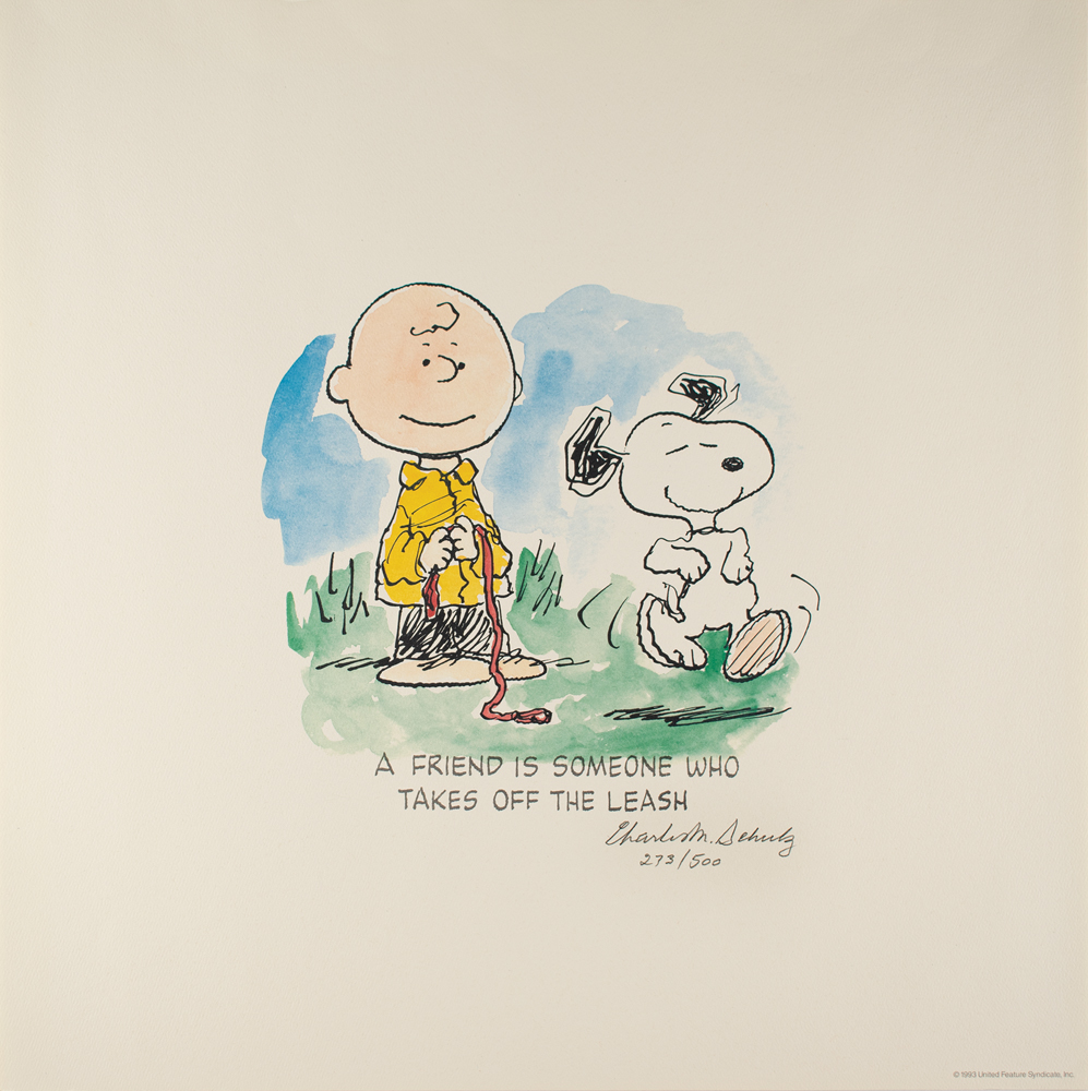 Wonderful limited edition color 18 x 18 Peanuts lithograph of a Charles Schulz work entitled 'A Friend Is…,' numbered 273/500, which shows Snoopy skipping away from Charlie Brown, with caption below reading: "A friend is someone who takes off the leash." Signed below in pencil, "Charles M. Schulz." In fine condition. Accompanied by a certificate of authenticity from Charles M. Schulz Limited Edition Prints.