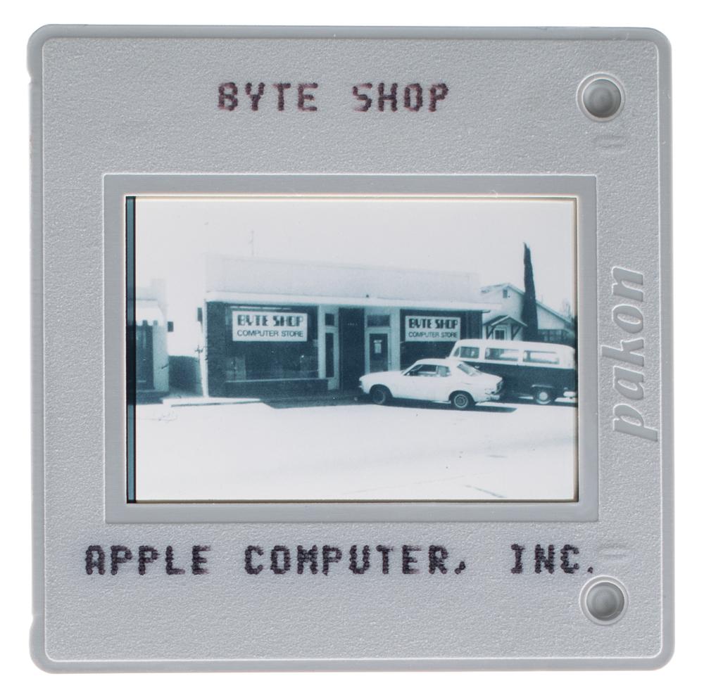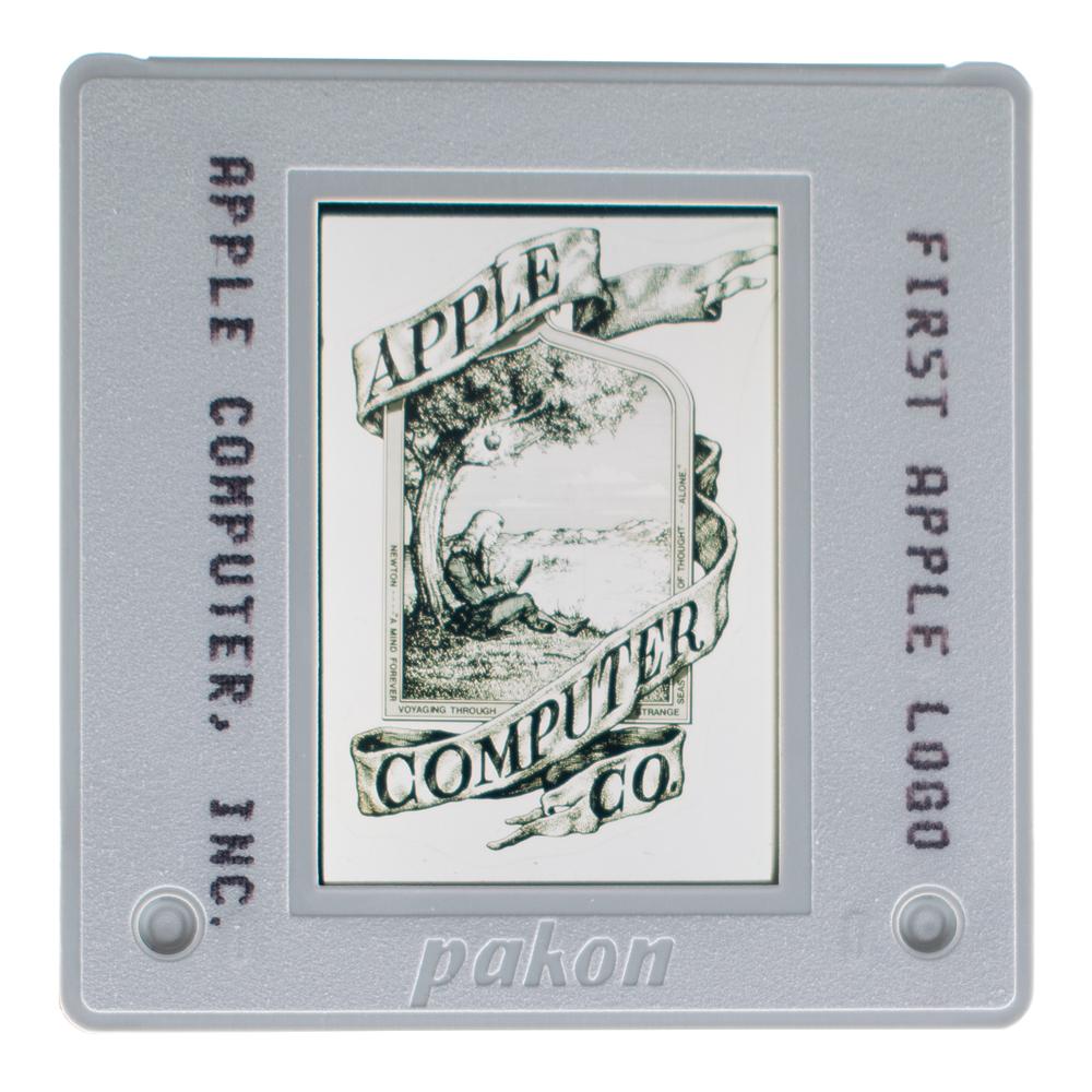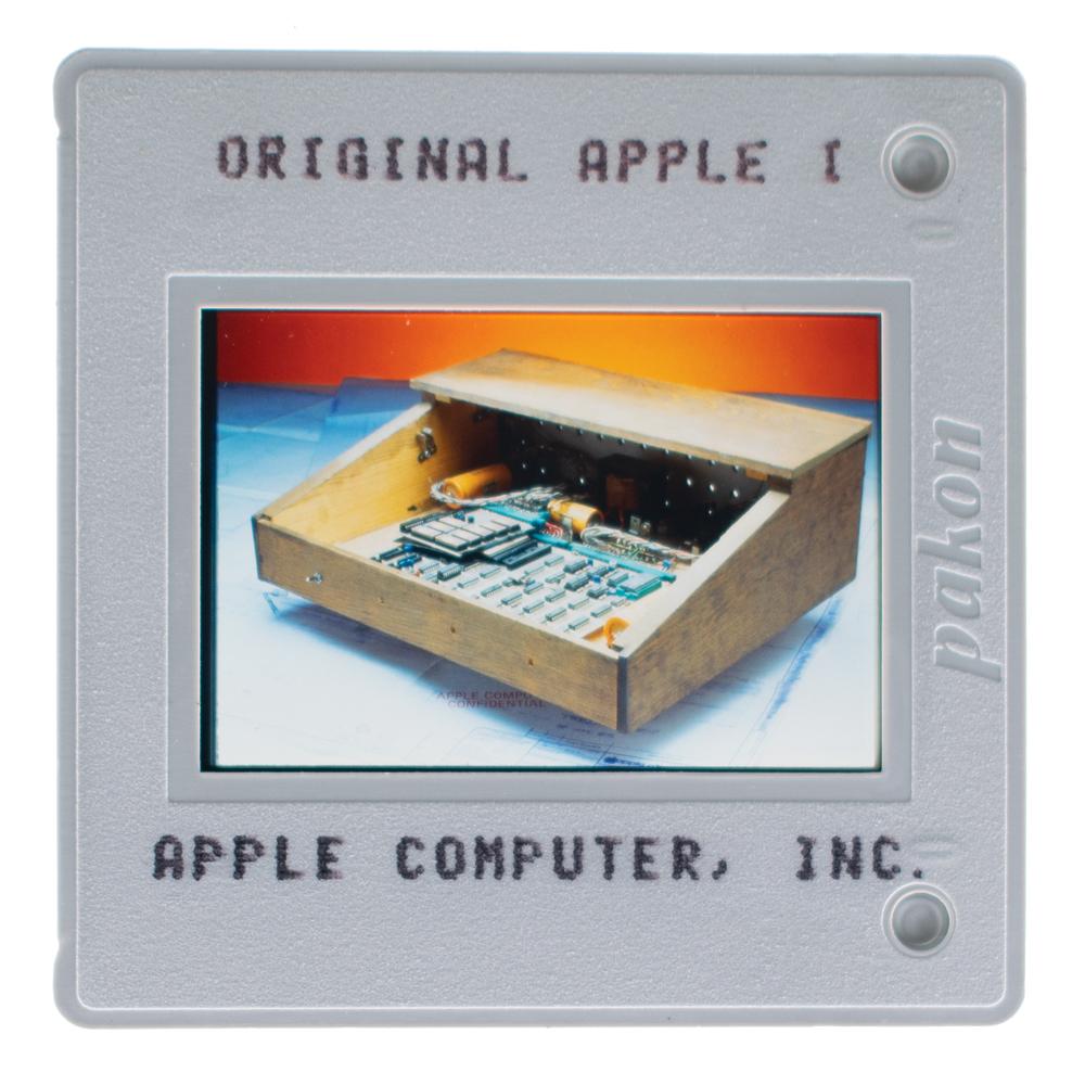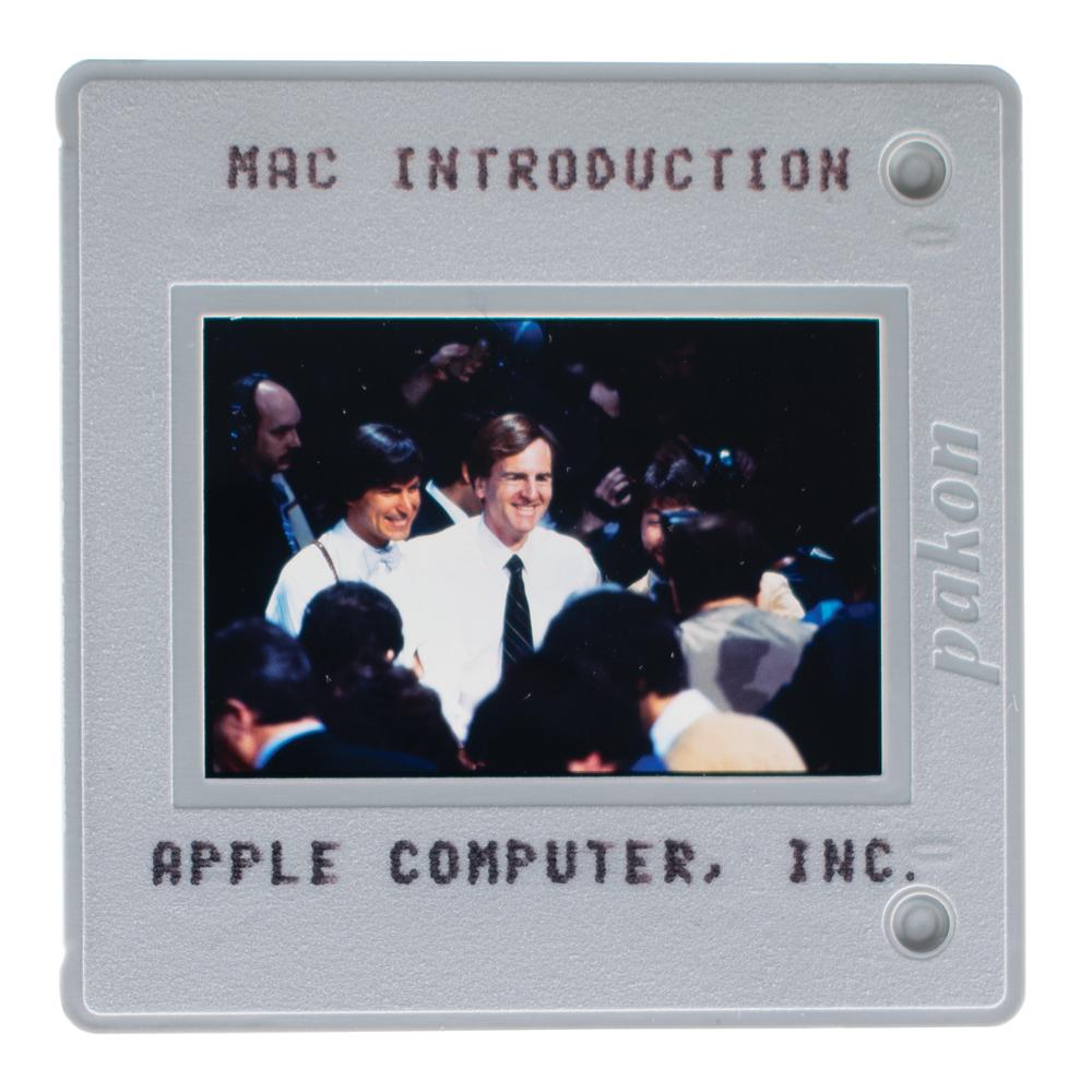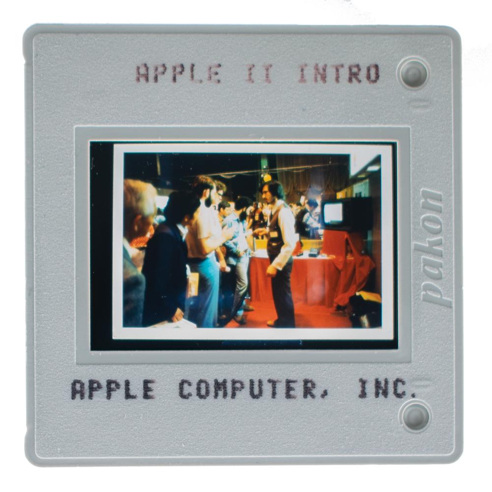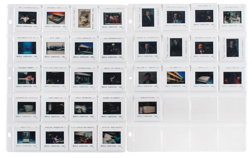 Group of 33 original vintage circa 1980s color 35mm presentation slides, all marked with a brief caption and "Apple Computer, Inc." The slides present a short, chronological history of the company, with especially noteworthy subjects including: the original Apple logo; an Apple I computer; the Byte Shop; Steve Jobs at the West Coast Computer Fair in 1977 introducing the Apple II; John Sculley introducing Apple IIc; Steve Jobs and John Sculley introducing the Macintosh; a still from the famed '1984' Super Bowl ad; and Apple’s Bandley 1 facility. Other images represent various markets (e.g. "International," "Consumer," "K-12 Education," "Desktop Publishing") or portray various Apple executives. In overall fine condition.