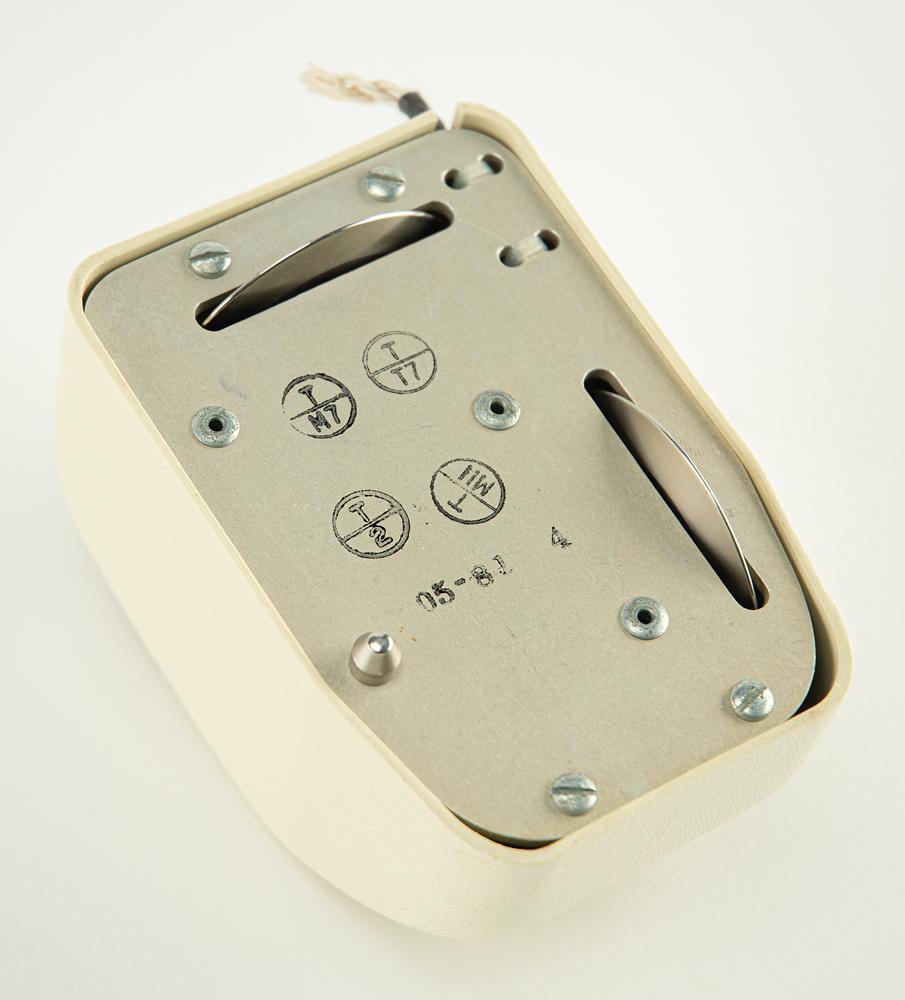 Rare, early three-button computer mouse designed by computer pioneer Douglas Engelbart, measuring approximately 4″ x 2.75″ x 2.5″, which utilizes two metal discs (corresponding to the X-axis and Y-axis) on the bottom to locate the position of the cursor, rather than a ball or optical light that came to be used later. This example has the cord (which has been severed) in the front. In fine condition.