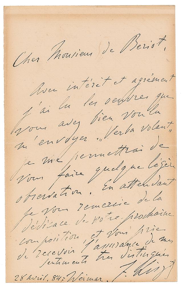 ALS in French, signed “F. Liszt,” one page, 5 x 8, April 28, 1884. Letter to "Monsieur de Beriot," in part (translated): "With interest and pleasure I have read the works that you have sent me. 'Verba volant.' I will allow myself to make some slight observation. In the meantime I thank you for the dedication of your productive position." In fine condition, with edge toning from prior display. An attractive, boldly penned letter from the master pianist and composer.