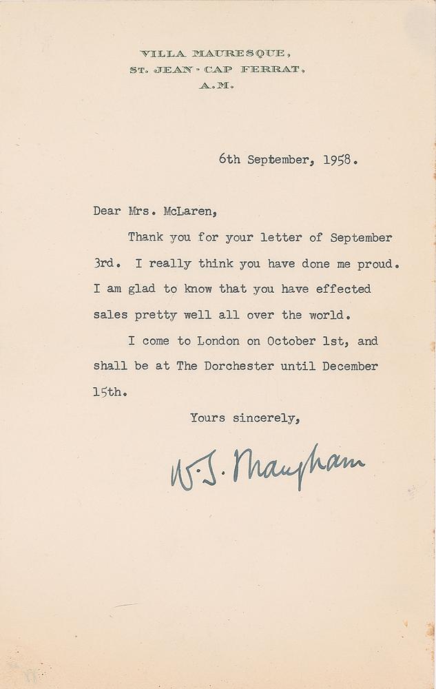 TLS signed “W. S. Maugham,” one page, 5.25 x 8.25, Villa Mauresque letterhead, September 6, 1958. Letter to Mrs. McLaren, in part: "Thank you for your letter of September 3rd. I really think you have done me proud. I am glad to know that you have effected sales pretty well all over the world." In fine condition.