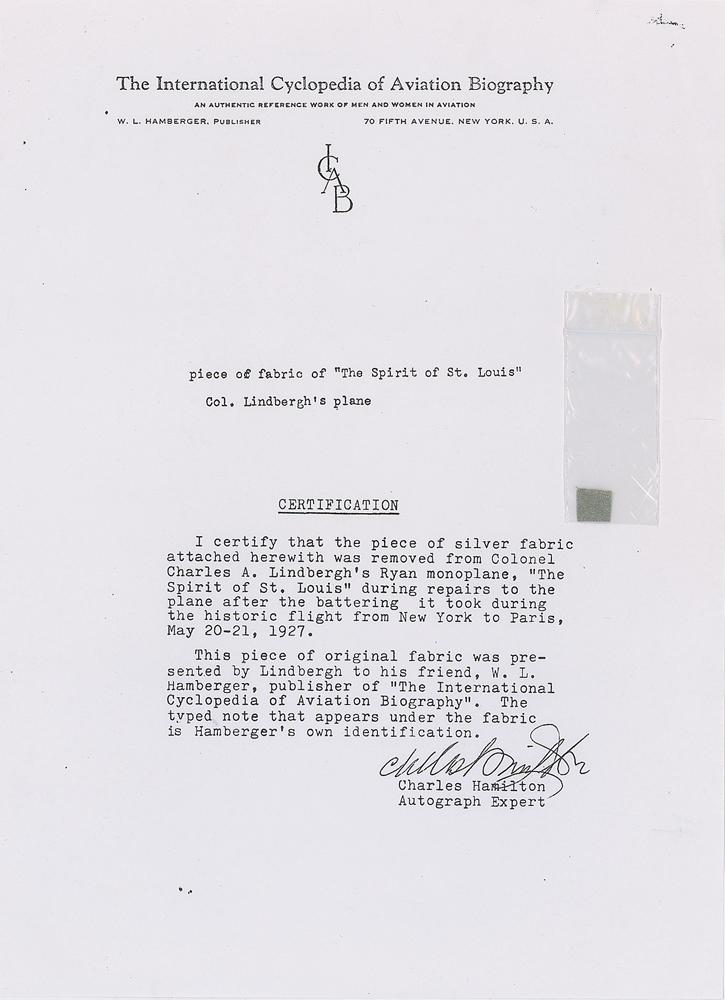 Tiny 3/8″ x 3/8″ swatch of flown fabric from Charles Lindbergh's Spirit of St. Louis aircraft cut from a larger piece, encapsulated in a small bag and affixed to a photocopied certificate of authenticity from noted dealer Charles Hamilton, describing the larger swatch that was presented by Lindbergh to his friend, W. L. Hamberger, publisher of 'The International Cyclopedia of Aviation Biography.' In fine condition.