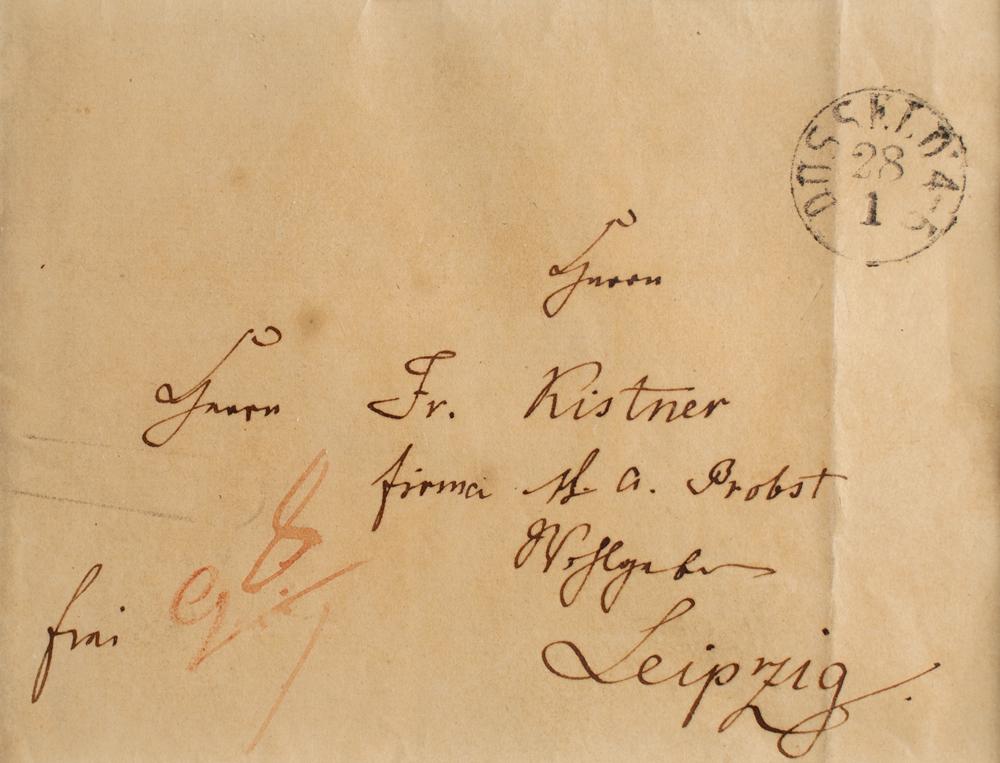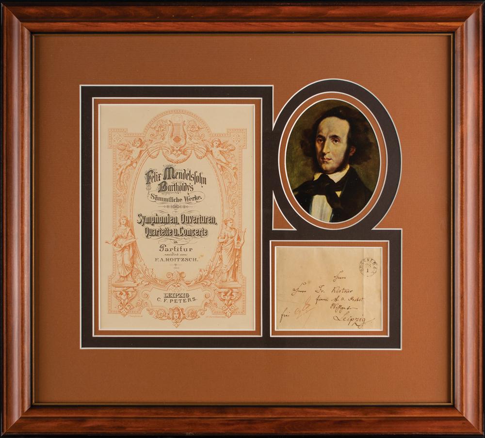 Unsigned mailing envelope, 4.25 x 3.25, addressed in the hand of Felix Mendelssohn to his publisher Friedrich Kistner of the firm H. A. Probst. Triple-matted and framed with a portrait and sheet music cover to an overall size of 20 x 17.75. In fine condition, with a paperclip impression to the left edge, and a vertical fold to the right side.
