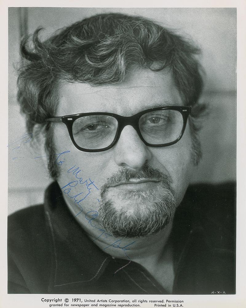 Glossy 8 x 10 United Artists publicity photo of Chayefsky in an up-close pose, signed and inscribed in blue ballpoint, "To Marty, Paddy Chayefsky.” In fine condition, with the beginning of a failed signature attempt next to his ear. Accompanied by a United Artists press release for Chayefsky's 1971 film The Hospital, for which Chayefsky won the Oscar for Best Original Screenplay.