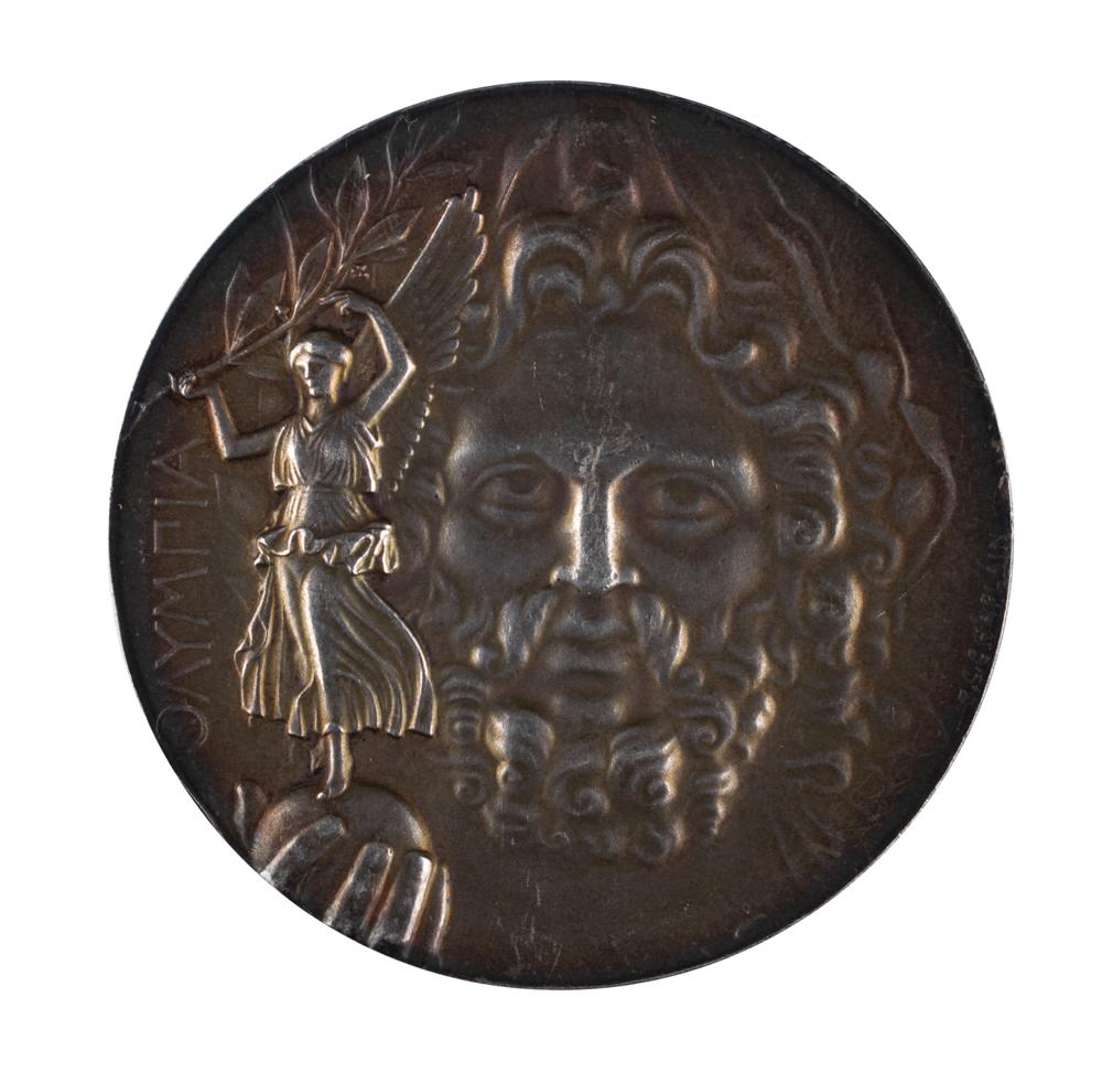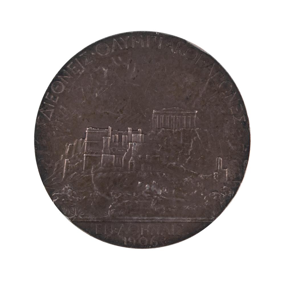 Sought-after winner’s medal issued for the Athens 1906 Intercalated Olympics. Silver, 50 mm, 58 gm, by Jules Clement Chaplain. The front depicts a relief portrait of Zeus holding Nike, the goddess of Victory, in the palm of his hand, with text along left side, “Olympia”; the reverse bears a detailed view of the Acropolis of Athens topped by the Parthenon, with raised Greek characters to upper and lower portion (translated), “International Olympic Games in Athens, 1906.” Stamped “Argent” on the edge. The winner’s medals for the 1906 Athens Games share the same design as the Athens Olympics from 1896, with the ceremony year serving as the lone distinction. The 1906 Athens Games were considered the Olympics by the press and participants, which included 854 athletes from twenty countries, but they were never officially sanctioned by the International Olympic Committee. A rare and gorgeous winner’s medal from the unofficial fourth Olympic Games.