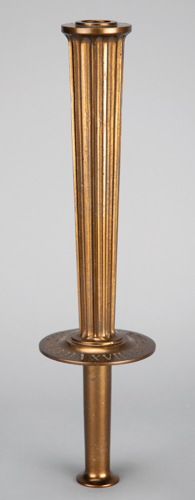 Official Rome 1960 Summer Olympics torch, constructed of bronzed aluminum, measuring 15.5″ in length and 3.75″ at its widest point, manufactured by the Curtisa firm of Bologna. The torch’s designer, Amedeo Maiuri, was a renowned Italian archaeologist famous for his studies of the Roman site of Pompeii. Inspired by the designs and patterns of the host city’s ancient ruins and monuments, the torch is grooved with slender conical fluting along its candlestick frame, features consistent with the classical touch of the 1960 Games. The torch platform bears the engraving, “Giochi della XVII Olympiade,” and maker’s marks, “M. F.—Curtisa—Bologna, 3375,” can be found inscribed on the bottom of the handle. Also included with the torch is its rare original cylindrical presentation case, which features wear and some scuffing, and denting to upper and lower covers. The Olympic flame was lit on August 12 in Olympia, Greece, and was carried a total of 1,863 km—excluding the flame’s voyage from Athens to Syracuse aboard the training ship Amerigo Vespucci—by over 1,500 torchbearers during its historic fourteen day relay. The XVII Olympiad earns the distinction of being the first Summer Olympics to be telecast in North America.