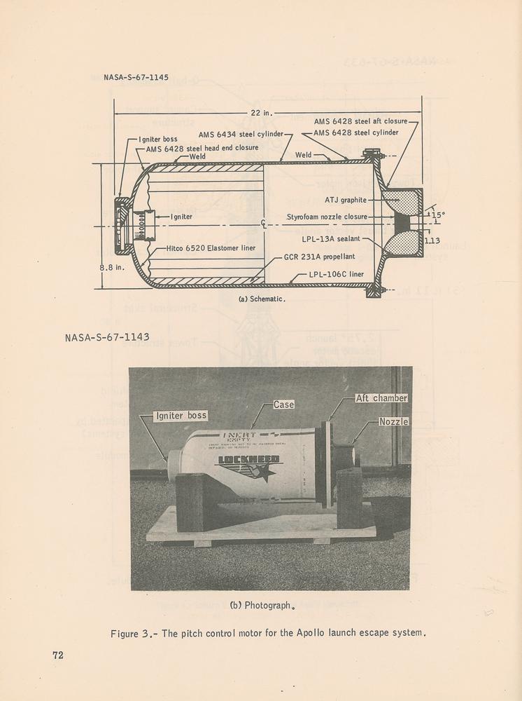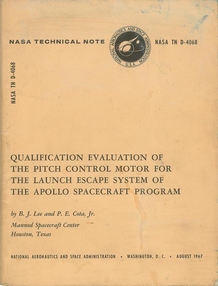 Uncommon official NASA technical note (TN D-4068) manual entitled "Qualification Evaluation of the Pitch Control Motor for the Launch Escape System of the Apollo Spacecraft Program," prepared by B. J. Lee and P. E. Cota, Jr., 93 pages, 8 x 10.5, dated August 1967. The abstract reads, in part: "This paper is a summary of the qualification test phase (consisting of environmental testing and static test firing) of the Apollo pitch control motor test program?The results of the qualification test program investigation confirm that the pitch control motor is qualified for the Apollo Spacecraft Program." Sections include: Symbols, Pitch Control Motor Description, Environmental Testing, Static Test Firing, and Conclusions. In very good to fine condition, with staining and soiling to the covers from use.