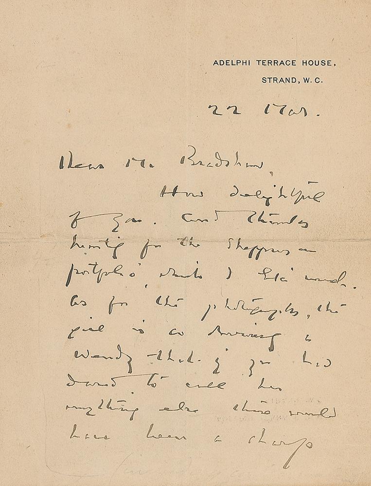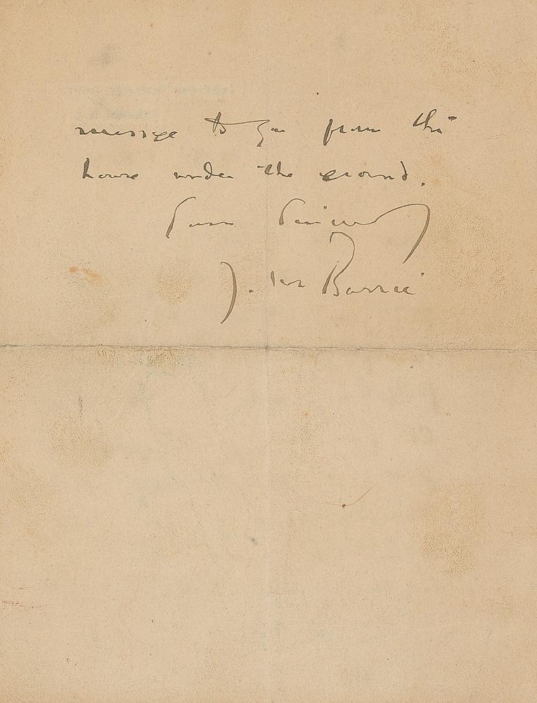 Desirable ALS signed “J. M. Barrie,” one page both sides, 5.25 x 7, Adelphi Terrace House letterhead, March 22. Addressed to "Mr. Bradshaw," the letter reads: "How delightful of you. And thanks heartily for the Shepperson portfolio, which I like much. As for the photographs, the girl is so mirroring of Wendy that if you had dared to call her anything else there would have been a sharp message from the house under the ground." In very good to fine condition, with light overall soiling, and a short split to the end of one of the intersecting folds. Claude Shepperson (1867-1921) was an artist and book illustrator who designed the women's costumes for the 1920 revival of Barrie's 1902 play, The Admirable Crichton. This letter twice touches upon Peter Pan: first with his mention of "Wendy," and then in the last line with "the house under the ground," which is an allusion to the book's seventh chapter, The Home Under the Ground.
