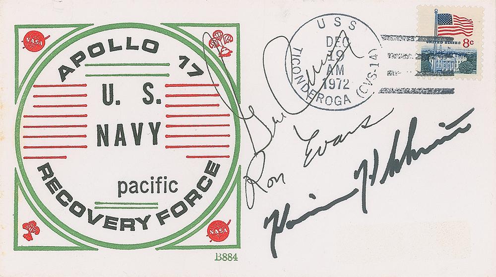 Apollo 17 recovery cover with a color cachet honoring the US Navy Pacific Recovery Force, postmarked aboard USS Ticonderoga on December 19, 1972, signed in black felt tip by Gene Cernan, Ron Evans, and Harrison Schmitt. In fine condition. An accompanying collector's note indicates that it was signed by Evans just prior to his death, and by Cernan and Schmitt at a 30th anniversary celebration at the KSC Visitor Center on December 13, 2002.