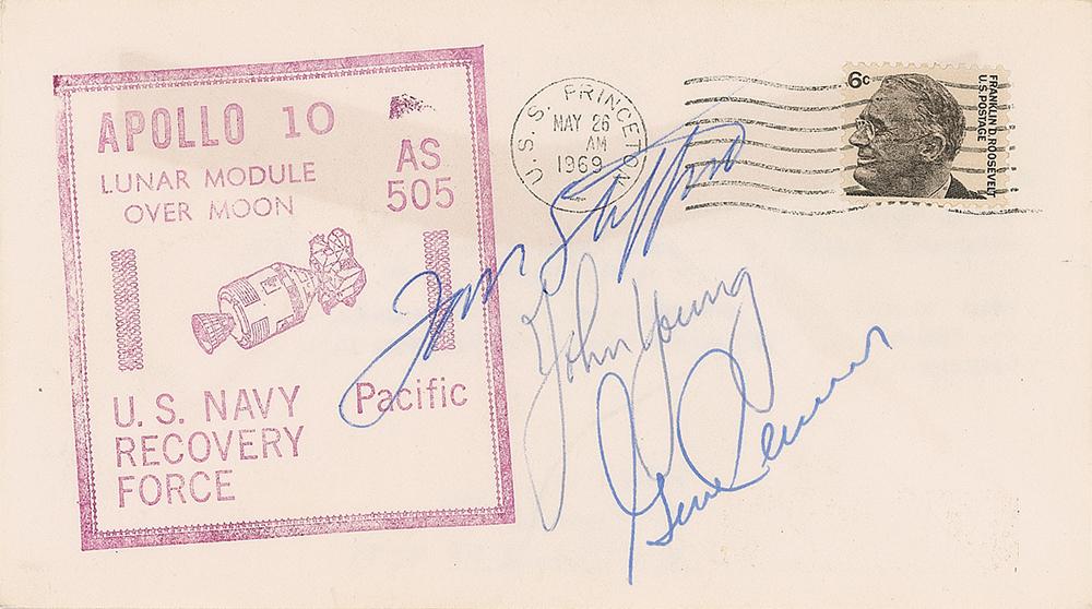 Apollo 10 recovery cover with a stamped cachet honoring the US Navy Pacific Recovery Force, postmarked aboard USS Princeton on May 26, 1969, signed in blue ballpoint by Tom Stafford, John Young, and Gene Cernan. Collector's notations penciled on the reverse indicate that it was signed by the astronauts in 1971-72. In fine condition.