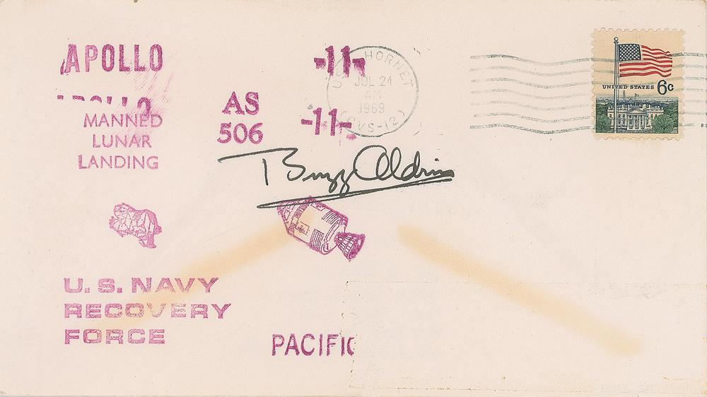 Apollo 11 recovery cover with a stamped cachet honoring the US Navy Pacific Recovery Force, postmarked aboard USS Hornet on July 24, 1969, signed black felt tip by Buzz Aldrin. A collector's notation penciled on the reverse indicates that it was signed through the mail in 1971. In fine condition, with light staining from the envelope glue.