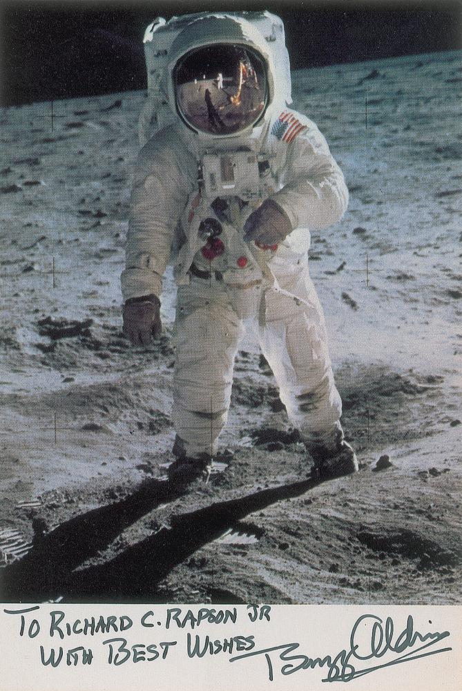 Color 4 x 6 postcard photo of the famous 'visor shot' of Aldrin on the lunar surface during Apollo 11, signed and inscribed in black felt tip, "To Richard C. Rapson Jr., With Best Wishes, Buzz Aldrin.” In very fine condition.