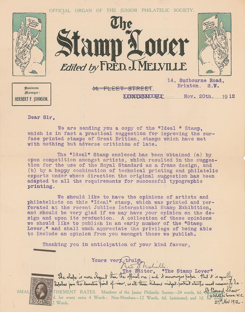 ANS signed "G. Bernard Shaw, 10 Adelphi Terrace W.C., 27th Nov. 1912," penned at the bottom of a letter sent to him by Fred J. Melville, editor of The Stamp Lover, one page, 8 x 10.25, November 20, 1912. Melville sends an example of "the 'Ideal' Stamp, which is in fact a practical suggestion for improving the surface printed stamps of Great Britain?printed and perforated at the recent Jubilee International Stamp Exhibition." Asked for his opinion of the stamp, Shaw writes: "The shape is more elegant than the official one; and it economises paper. But it is equally hopeless from the decorative point of view, as all these hideous midget-portrait stamps must necessarily be." In fine condition. Accompanied by five other examples of the 'Ideal Stamp,' printed in different colors.