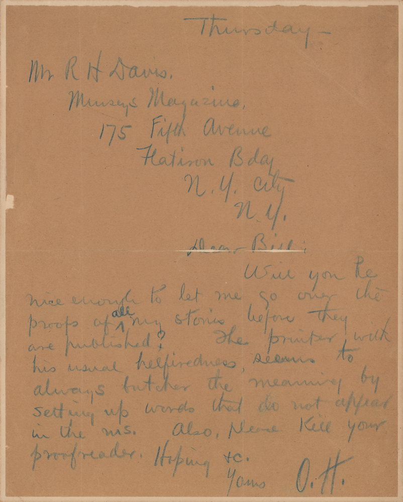 Sought-after ALS in pencil, signed “O. H.,” one page, 8 x 10, no date. Letter to R. H. Davis of Munsey's Magazine, in full: "Will you be nice enough to let me go over the proofs of my stories before they are published? The printer with his usual helfiredness, seems to always butcher the meaning by setting up words that do not appear in the MS. Also, please kill your proofreader." The letter is affixed to a slightly larger cardstock mount. In very good to fine condition, with three small areas of paper loss.