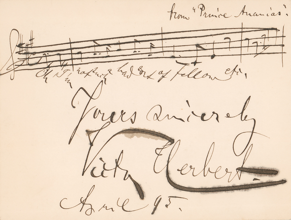 AMQS on an off-white 3.75 x 3 card, which is signed in fountain pen, "Your sincerely, Victor Herbert, April 95." Herbert adds four bars of music "from 'Prince Ananias,'" adding some lyrics below. In fine condition. Prince Ananias was the first operetta composed by Herbert. It was first produced by a troupe called The Bostonians at The Broadway Theatre on November 20, 1894.