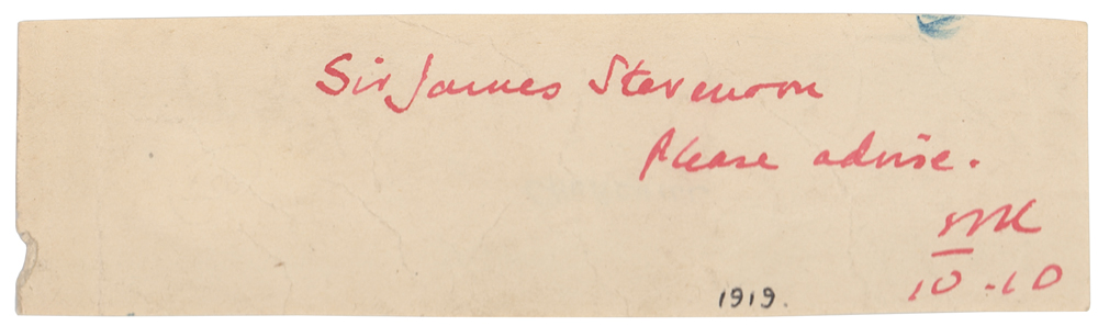 ANS signed “WC,” penned in bold red ink on an off-white 4.5 x 1.25 slip, dated October 10 [1919]. In full: "Sir James Stevenson, Please advise." In fine condition. James Stevenson (1873-1926), known as Sir James Stevenson, Bt, between 1917 and 1924, was a British businessman and civil servant who worked as a personal adviser to Winston Churchill, then Secretary of State for the Colonies.