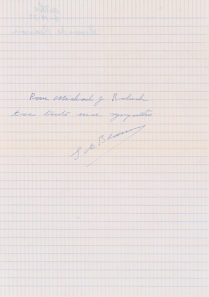 French existentialist, writer, and social essayist (1908-1986). Ink signature and inscription, "Pour Michael J. Robuck, Avec toute ma sympathie, S. de Beauvoir,” on an off-white 8.25 x 11.5 sheet. In fine condition, with intersecting folds. Accompanied by the original mailing envelope, postmarked in 1972.