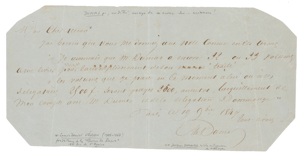 ALS in French, signed “Al. Dumas,” one page, 10 x 4.75, November 19, 1847. Letter to French opera manager and publisher Louis-Désiré Véron, in part (translated): "I need a certificate from you with the following words: I confirm hereby that Mr. Dumas has to supply to me with still 32 or 33 volumes for the fulfillment of his contract. For these volumes, which I pay currently 2500 Frs. to him or his authorized person, further 3500 Frs. in the case of supply…will be paid to Mr. Dumas." In very good to fine condition, with intersecting folds, trimmed edges, and light overall creasing.
