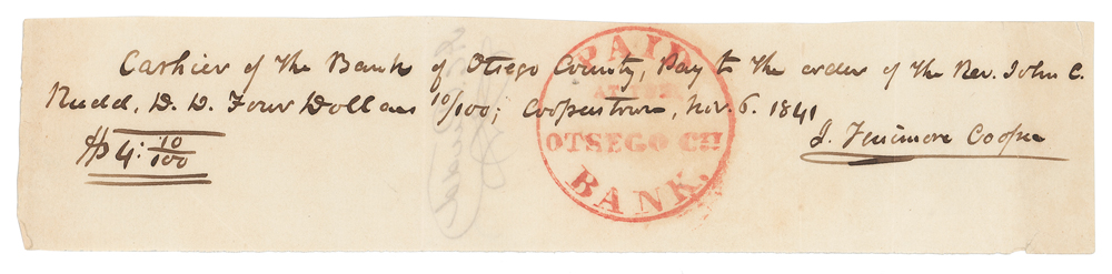 ADS, signed “J. Fenimore Cooper,” one page, 7.75 x 1.75, November 6, 1841. Pay order issued to the "Cashier of the Banks of Otsego County," directing the payment of $4.10 to "the order of Rev. John C. Rudd, D. D." Signed neatly at the conclusion by Cooper. In fine condition.