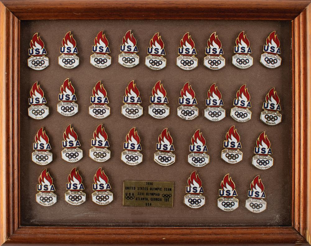 Collection of 32 Team USA pins issued for the Atlanta 1996 Summer Olympics, each .75 x 1.5, depicting a lit “USA” torch above Olympic rings with “1996 Olympic Team” and the name of the team, sport, or team position, including: Olympic Team, Archery, Athletics, Badminton, Baseball, Basketball, Boxing, Canoe / Kayak, Cycling, Diving, Equestrian, Fencing, Gymnastics, Handball, Field Hockey, Judo, Modern pentathlon, Rowing, Shooting, Soccer, Softball, Swimming, Synchronized Swimming, Table tennis, Tennis, Volleyball, Water Polo, Weightlifting, Wrestling, Yachting, Medical, and Staff. All are mounted and framed to an overall size of 12.75 x 9.75. In overall fine condition.