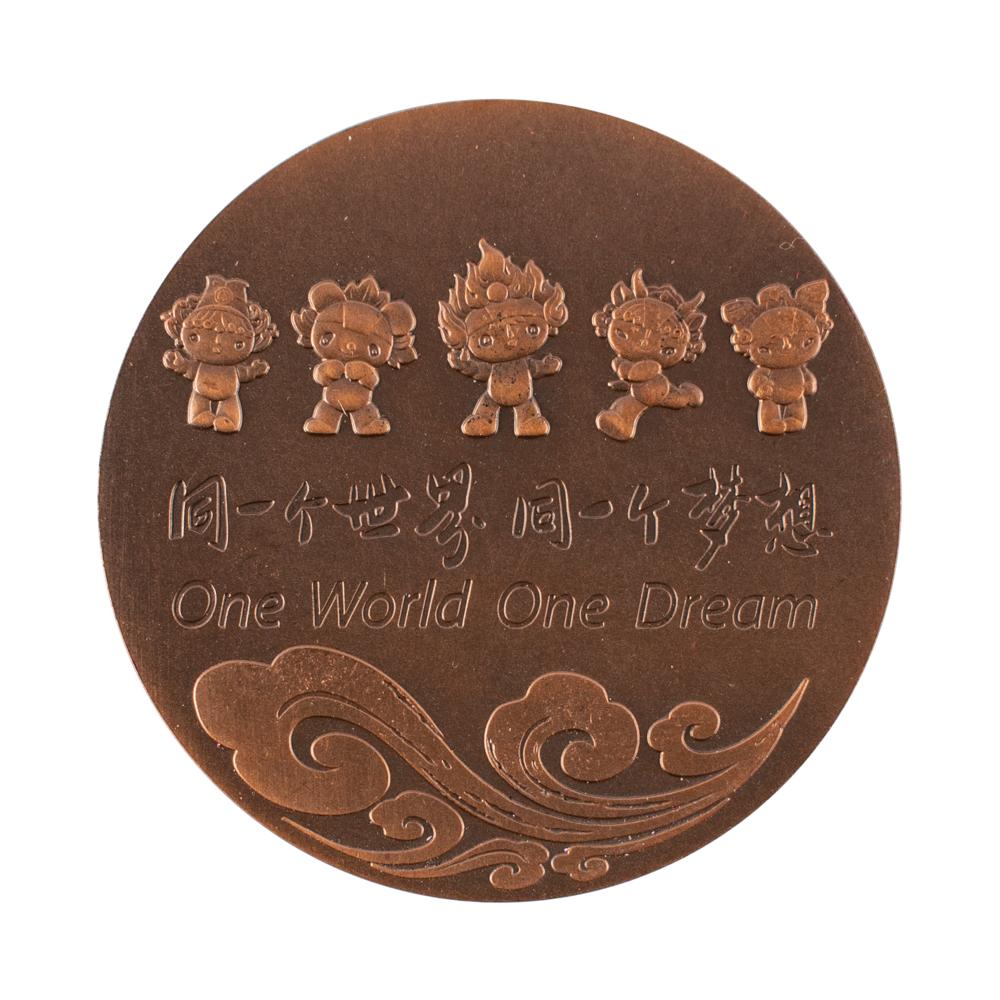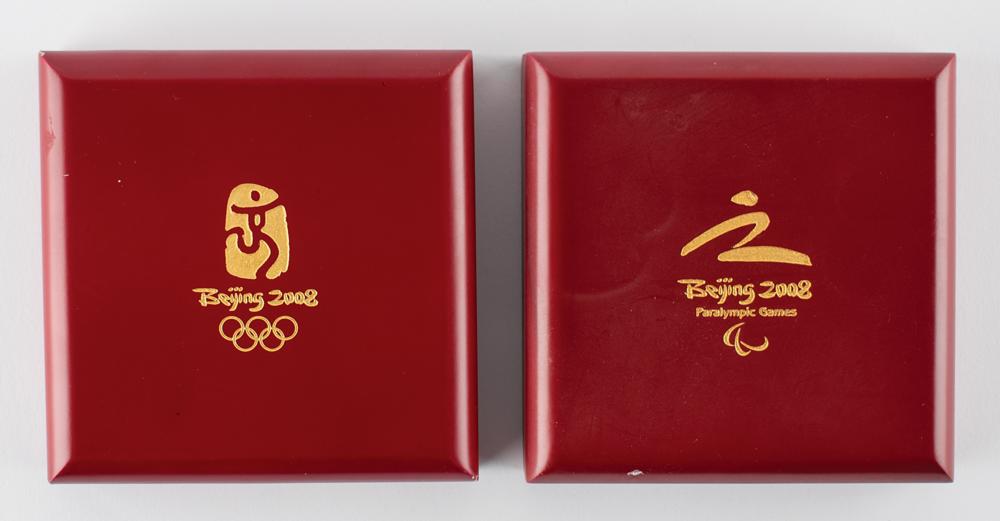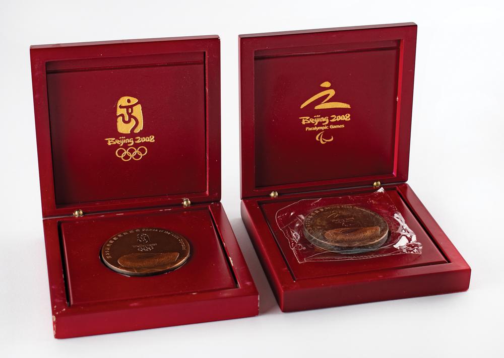 Appealing pair of participation medals issued for the Beijing 2008 Summer Olympics and Paralympics. Both medals are bronze, 55 mm, 122 gm, with the fronts featuring the Bird’s Nest Olympic stadium, their respective Games logo, and raised Chinese and English text along the top; and the reverse sides depict gusts of wind and engraved Chinese and English text, “One World One Dream,” with the Olympics medal showing five Fuwa mascots, and the Paralympic medal showing the cow Fu Niu Lele. Both medals include their original red presentation case, which bear a few scuffs. The Paralympic medal is sealed in a plastic pouch.