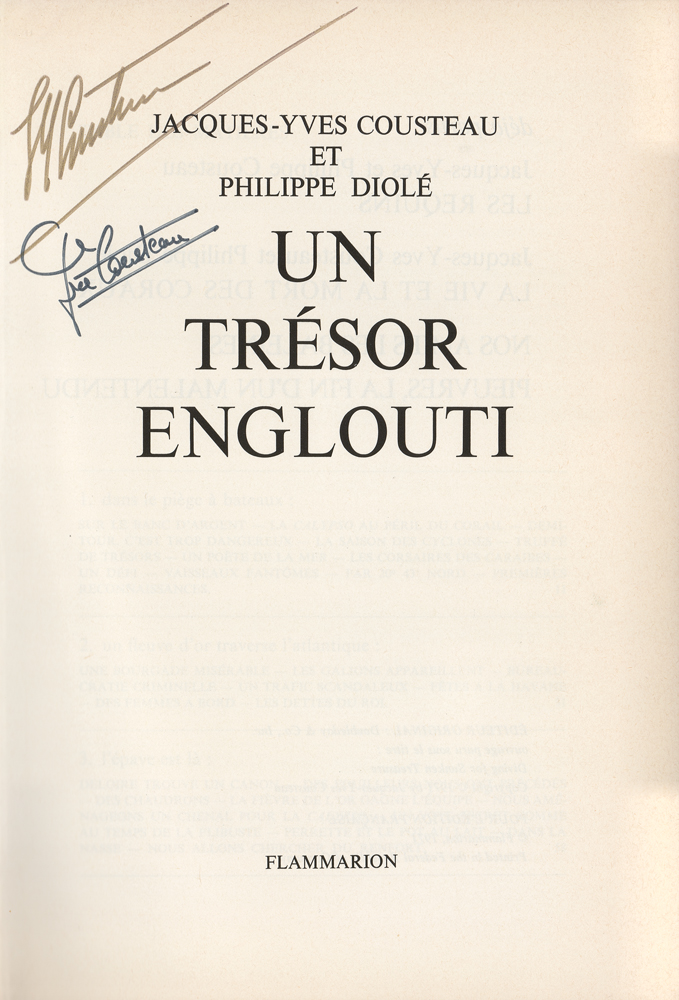 Signed book: Un Trésor Englouti [A Sunken Treasure]. Germany: Flammarion, 1971. Hardcover with dust jacket, 7.25 x 10.5, 298 pages. Signed on the title page in felt tip by Jacques Cousteau and his son, Jean-Michel Cousteau. In very good to fine condition, with some wear and small tears to dust jacket edges.