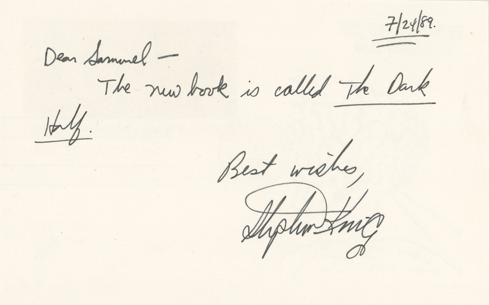 ALS, penned on the reverse of a 5.5 x 3.5 postal cover with a stamped Mount St. Helens cachet, July 24, 1989. In full: "Dear Samuel—The new book is called The Dark Half. Best wishes, Stephen King." In fine condition.