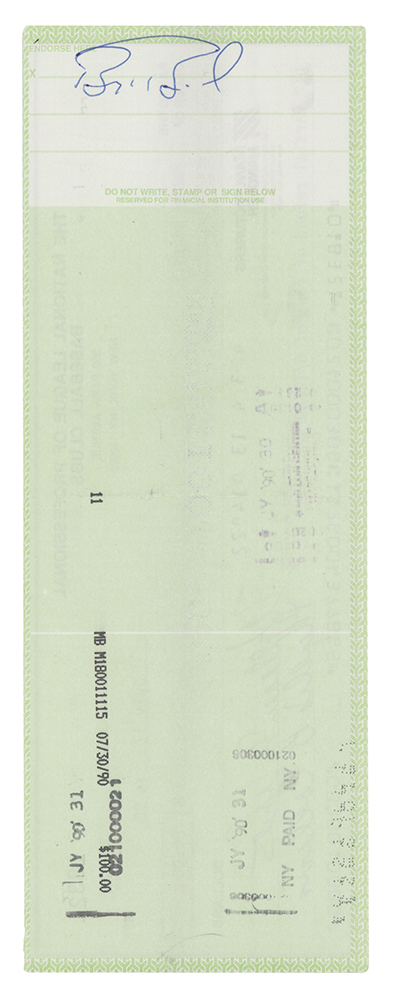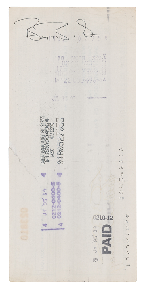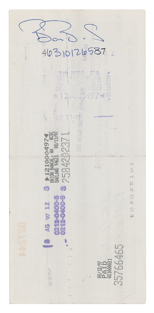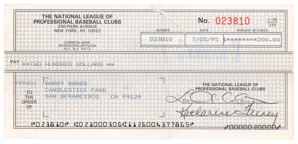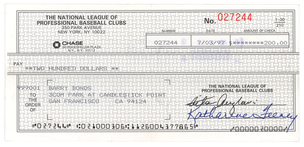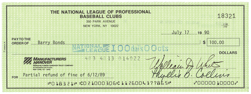Lot of three National League of Professional Baseball Clubs checks, 7.5 x 3.5 and 8.25 x 3, dated 1990, 1995, and 1997, each filled out in type and made payable to Barry Bonds for either $100 or $200. Reverse of each is endorsed on the reverse in ballpoint by Bonds. Memo field of 1990 check notes: “Partial refund of fine of 6/12/89.” Two checks are countersigned by National League President Bill White and Leonard S. Coleman, Jr. In overall very good to fine condition, with a tear to top edge of 1995 check.