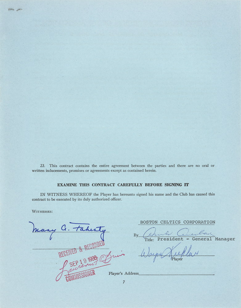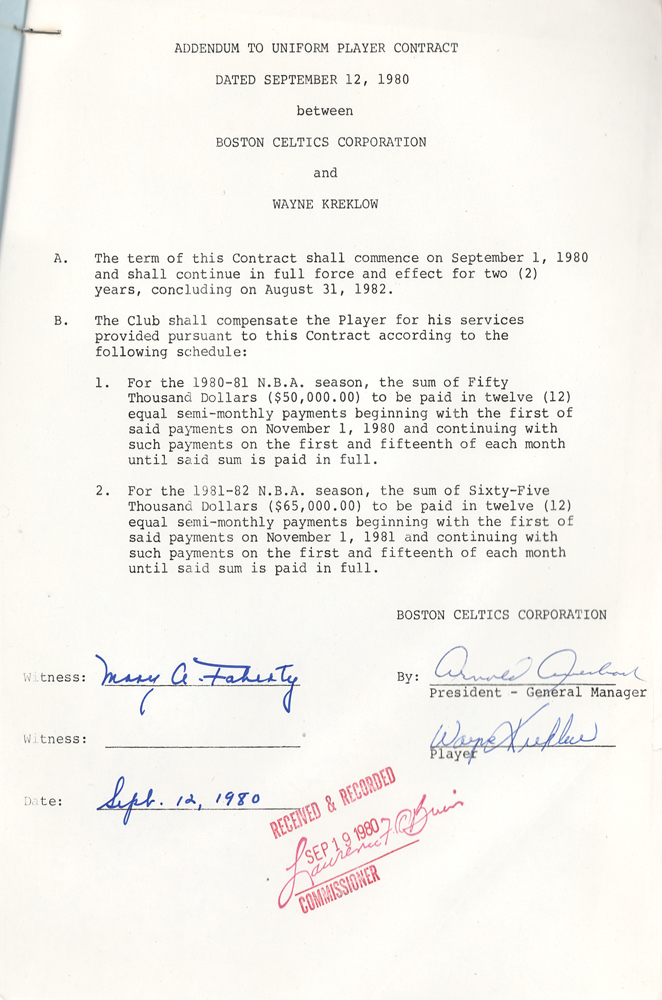 DS, signed “Arnold Auerbach," nine pages, 8.5 x 10.75, September 12, 1980. A rookie or veteran "Two or More Seasons" NBA 'Uniform Player Contract,' between the Boston Celtics and Wayne Kreklow for the term of two years. Signed at the bottom of the seventh page in blue ballpoint by Auerbach, who also signs an addendum listing Kreklow's two-year salary at $115,000. In fine condition.