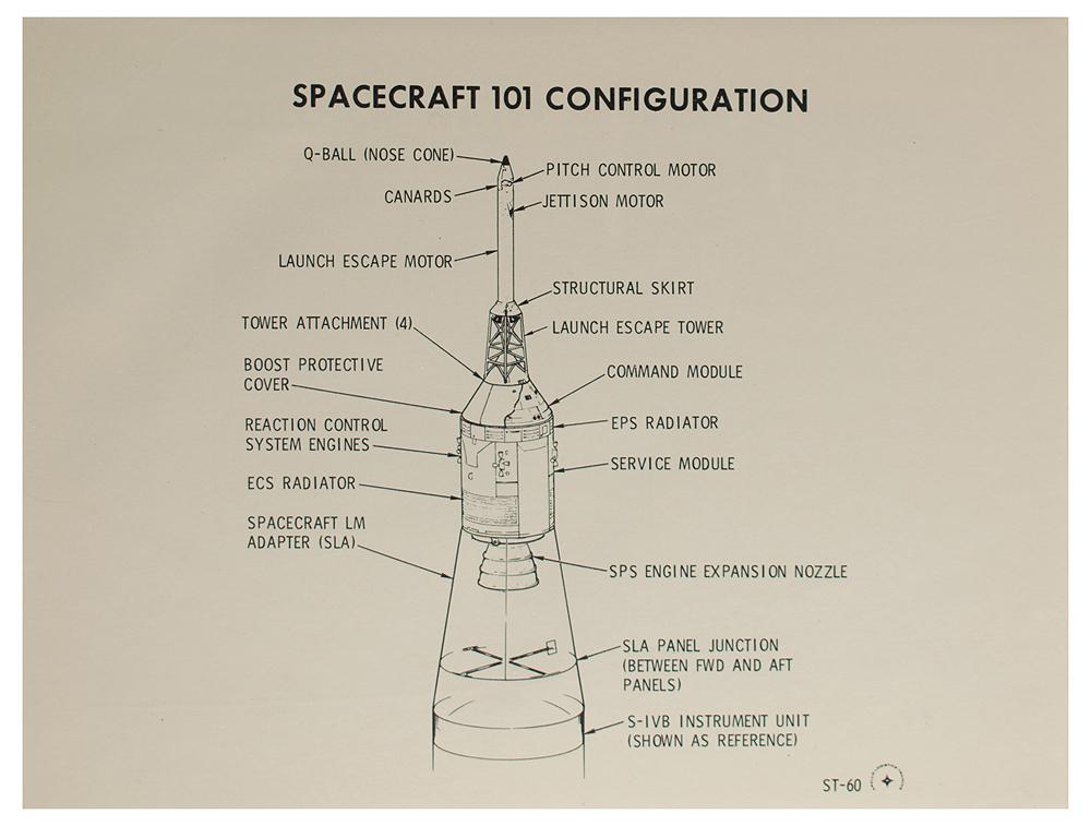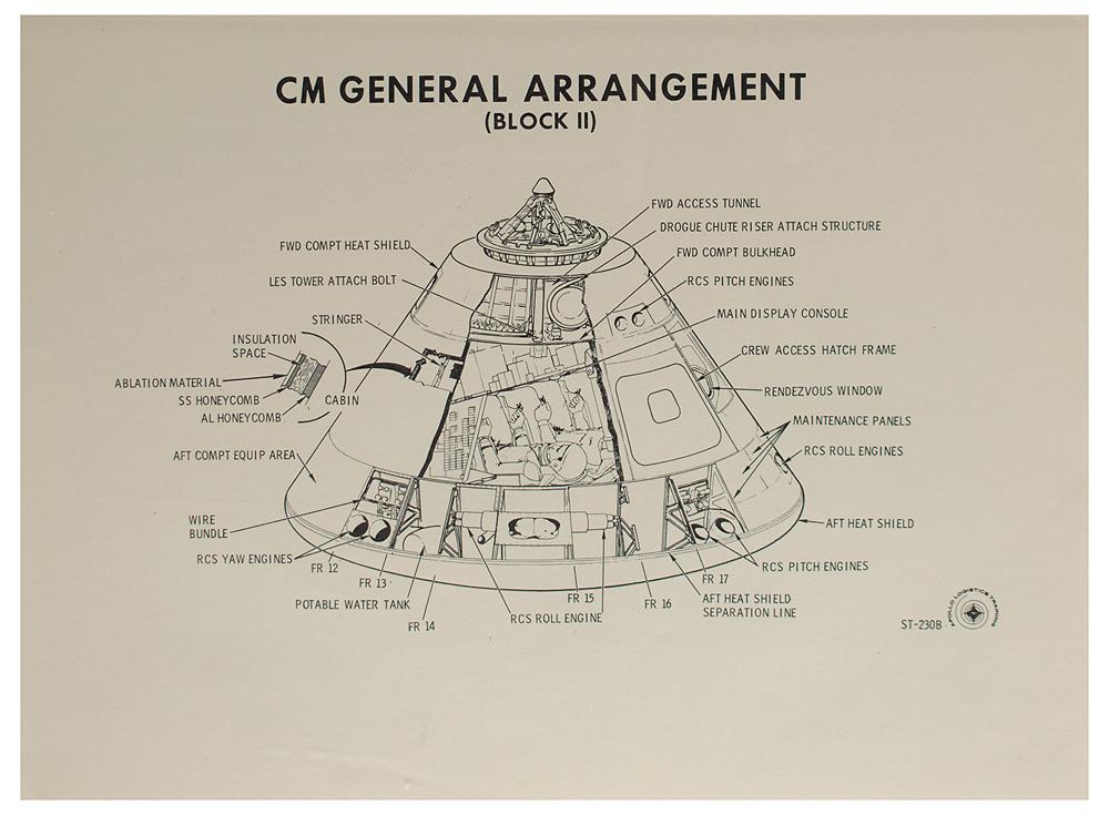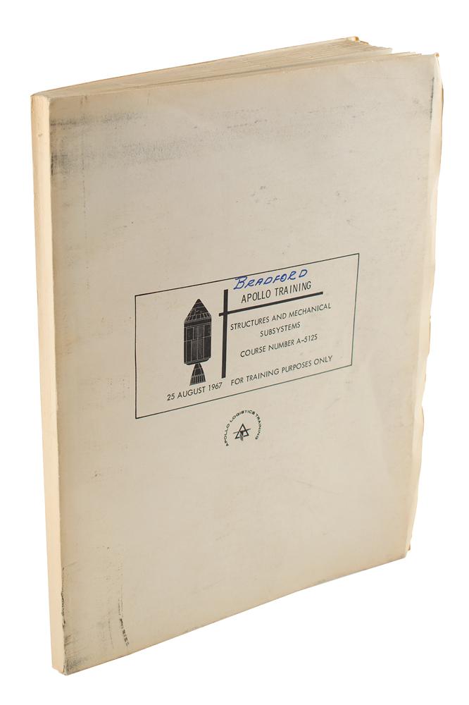 Official Apollo Logistics Training manual entitled "Apollo Training: Structures and Mechanical Subsystems, Course Number A-512S," 90 pages, 8.75 x 11, dated August 25, 1967. The manual has six tabbed sections for "Introduction," "Launch Escape System Structures," "Command Module," "Mechanical Systems," "Service Module Structure," and "Adapter Structure," all filled with single-sided, highly detailed full-page diagrams of the various Block II spacecraft components and systems. The front cover is marked "Bradford" in ink. In fine condition, with some rubbing wear and light edge creasing to covers; interior pages are very fine.