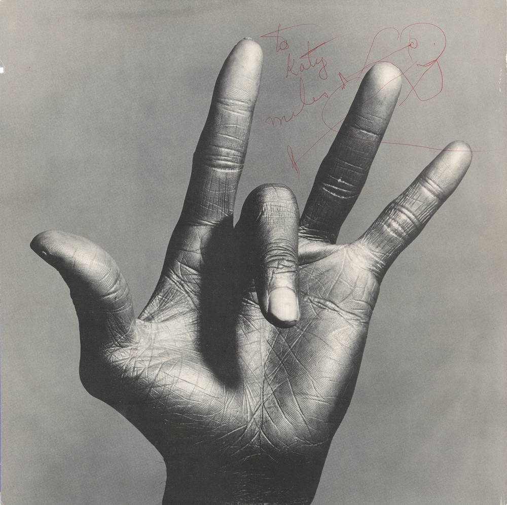 Tutu promo album signed and inscribed on the inner sleeve in red ballpoint, "To Katy, Miles," with a great abstract sketch of a trumpeter to the right side. In fine condition. The record is included.