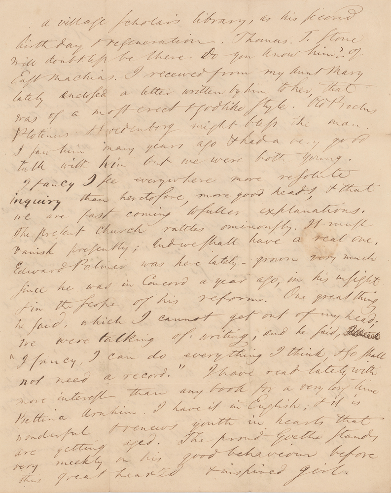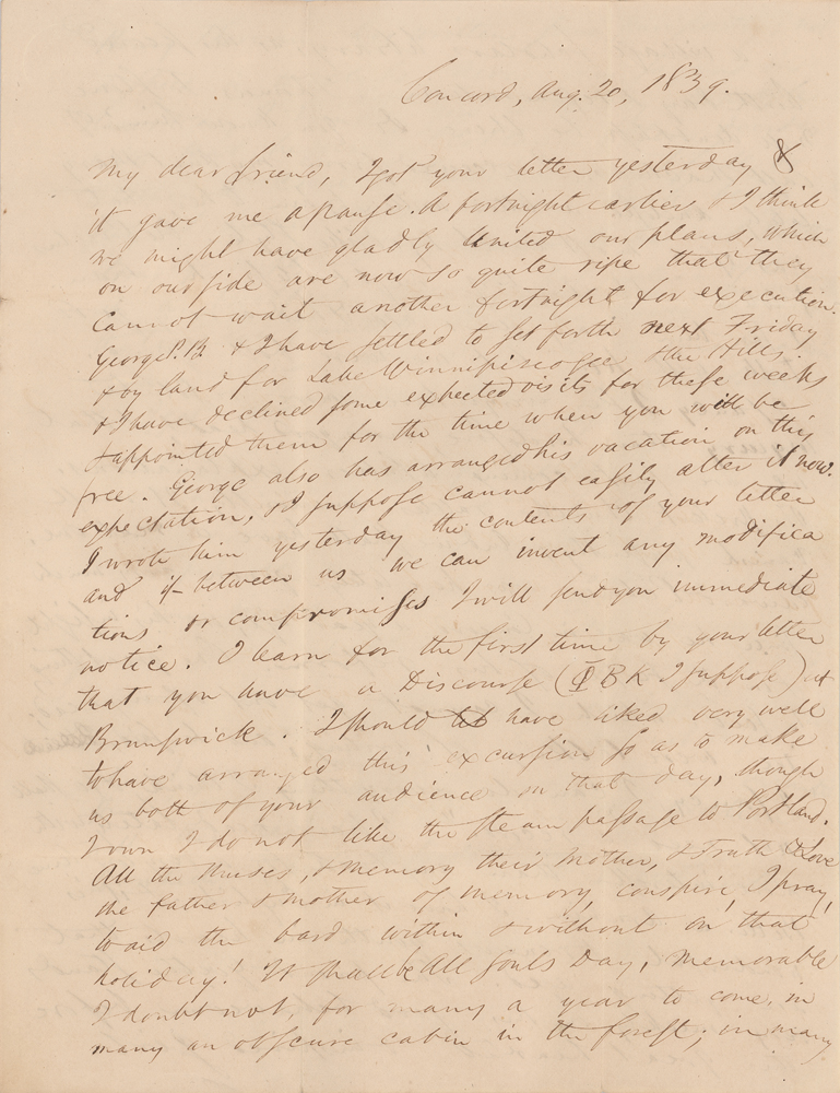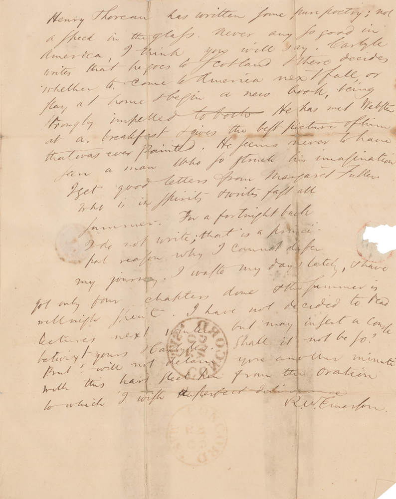 ALS signed “R. W. Emerson,” three pages on two adjoining sheets, 7.75 x 9.75, August 20, 1839. Letter to Frederick Henry Hedge in Bangor, Maine, written from Concord, discussing travel plans and literature. In part: "Edward Palmer was here lately—grown very much since he was in Concord a year ago, in his insight & in the scope of his reform. One great thing he said, which I cannot get out of my head; we were talking of writing, and he said, 'I fancy, I can do everything I think, & so shall not need a record.' I have read lately with more interest than any book for a very long time Bettina Arnim. I have it in English; & it is wonderful & renews youth in hearts that are getting aged. The proud Goethe stands very meekly on his good behaviour before this great hearted & inspired girl. Henry Thoreau has written some pure poetry; not a speck in the glass. Never any so good in America, I think, you will say. Carlyle writes that he goes to Scotland & there decides whether to come to America next fall, or stay at home & begin a new book, being strongly impelled to do both. He has met Webster at a breakfast & gives the best picture of him that was ever painted. He seems never to have seen a man who so struck his imagination. I get good letters from Margaret Fuller who is in spirits?I waste my days lately, & have got only four chapters done & the summer is well nigh spent." In very good to fine condition, with seal-related paper loss to the last page, and old tape reinforcing the folds on the integral address leaf. An utterly fascinating letter name-dropping several leading figures of the Transcendentalist movement, including an important early reference to Henry David Thoreau.